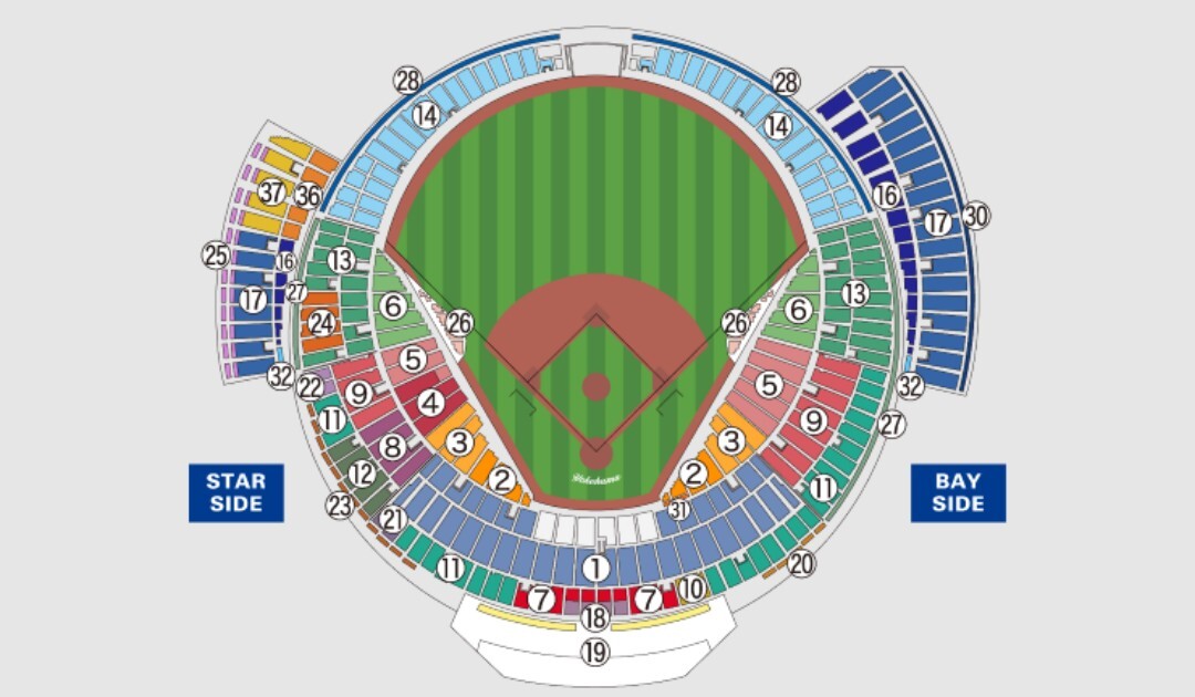 今回はビジター専用応援エリアは、こちらのビジターウィングフロント席、その後ろのビジターウィング席(STAR SIDE 3塁側)のみですので、巨人ファンの方は是非如何でしょうか?