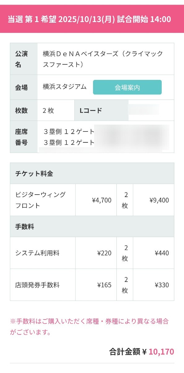 一般金額 一般4700円×2枚+システム利用料金440円+発券手数料330円=10170円