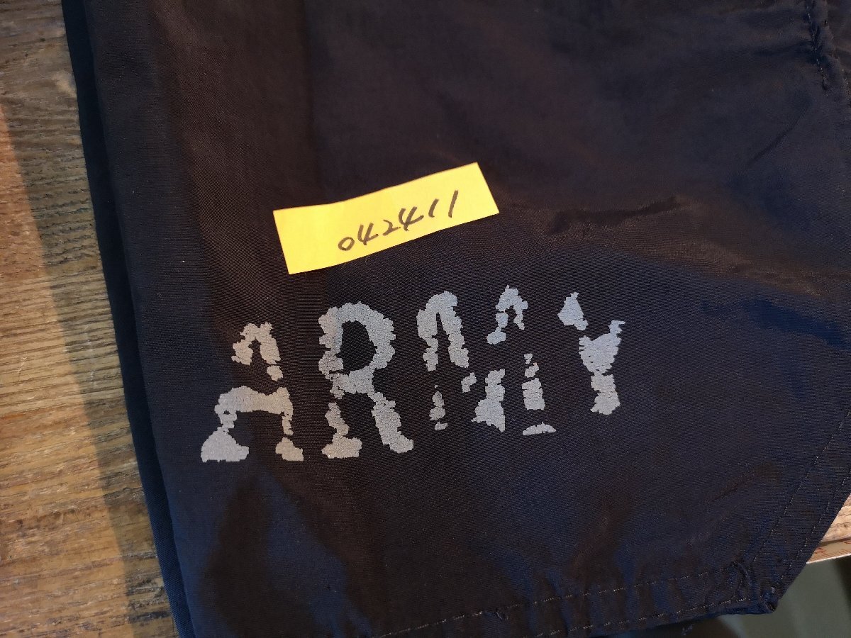 3枚目までの写真は流用です。 USアーミー放出品の本物トレーニングジョグパンツ。素材はさらさらのナイロン、インナーにSUPPLEXのホールド入り。ARMYのプリントは夜も安心のリフレクター。 サイズSで全長42cm、股下12cm、ウエストが60から80センチ程度です。 ヤマトネコポス便にて全国200円でお送りいたします。落札価格にプラスでお願いします。