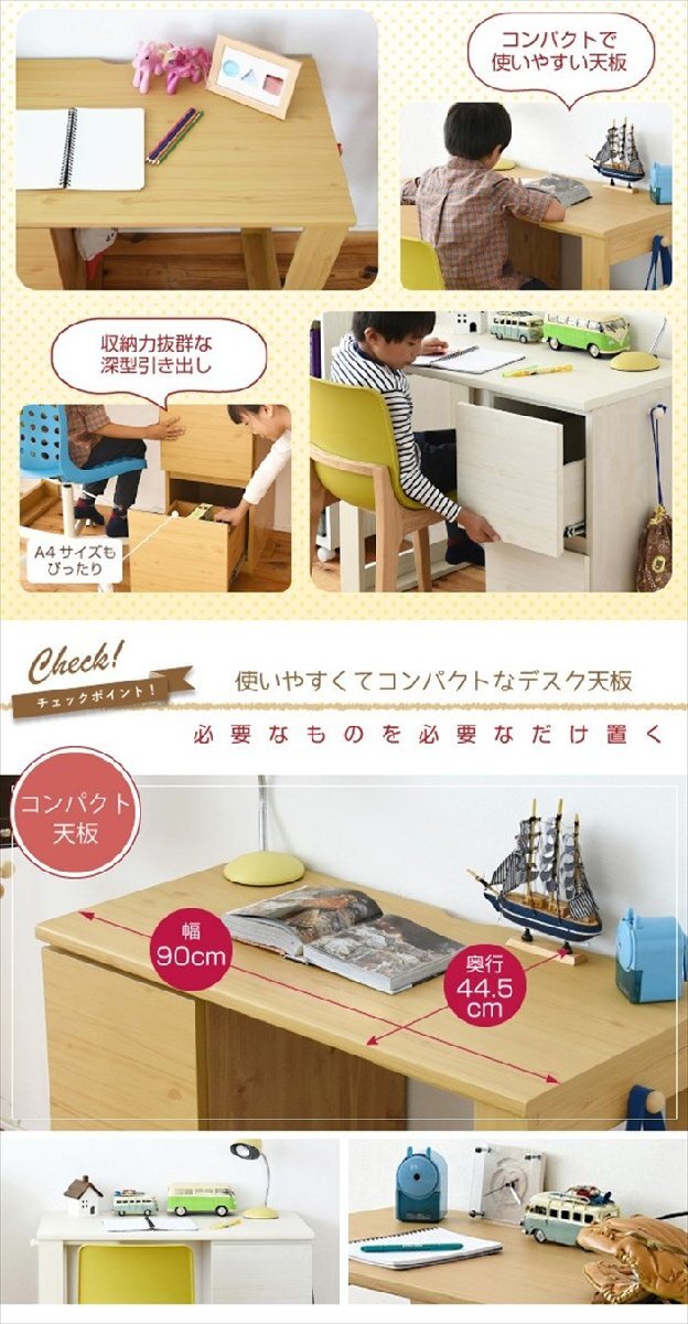 | 飾らないシンプルなデザインなので、子どもから大人まで年齢問わず使えるコンパクトデスク。 幅90×奥行45で、お部屋を選ばず1人部屋でもリビングでも使用しやすい薄型設計。 |