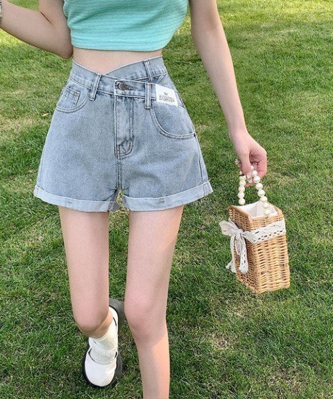 裾に向けて広がったAラインシルエットが、脚をほっそりと長く見せてくれるデニムショートパンツです。