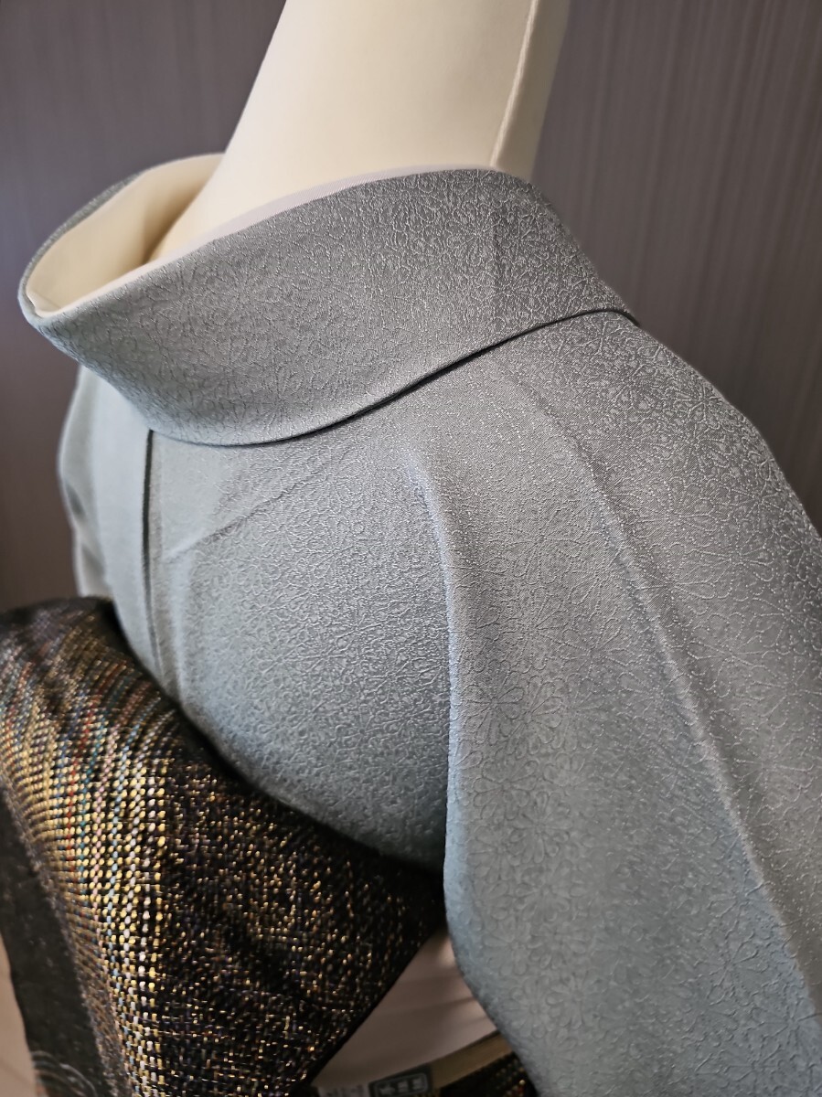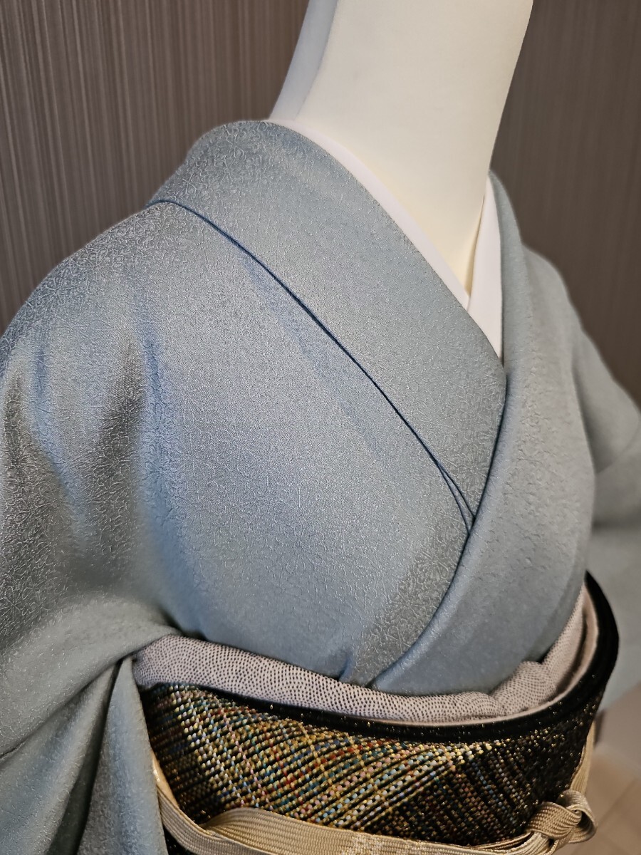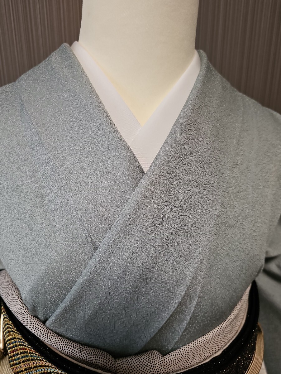 ★上質縮緬生地、菊花織地文様、青磁鼠がかった青白橡系の色味、気品有るしっとりとした美しさを醸し出す上等なお召し物でございます。
