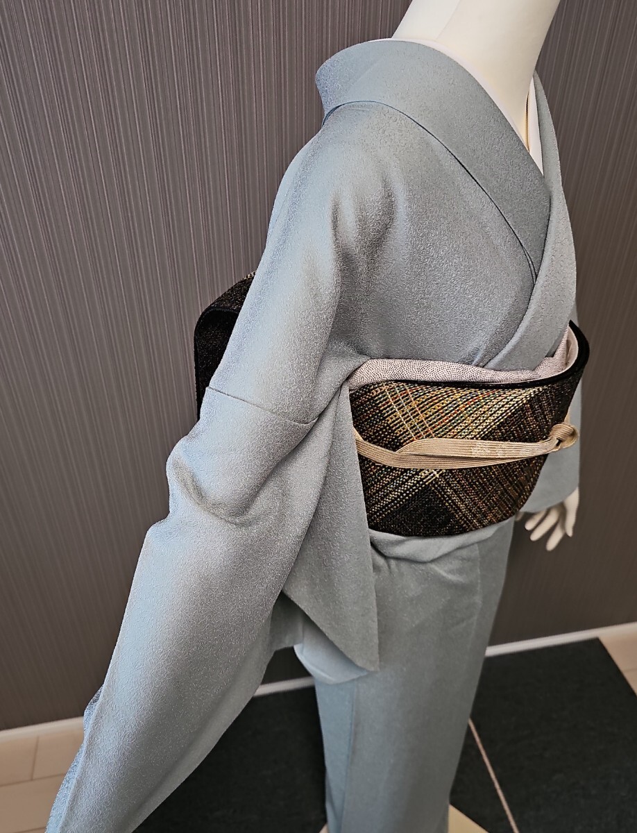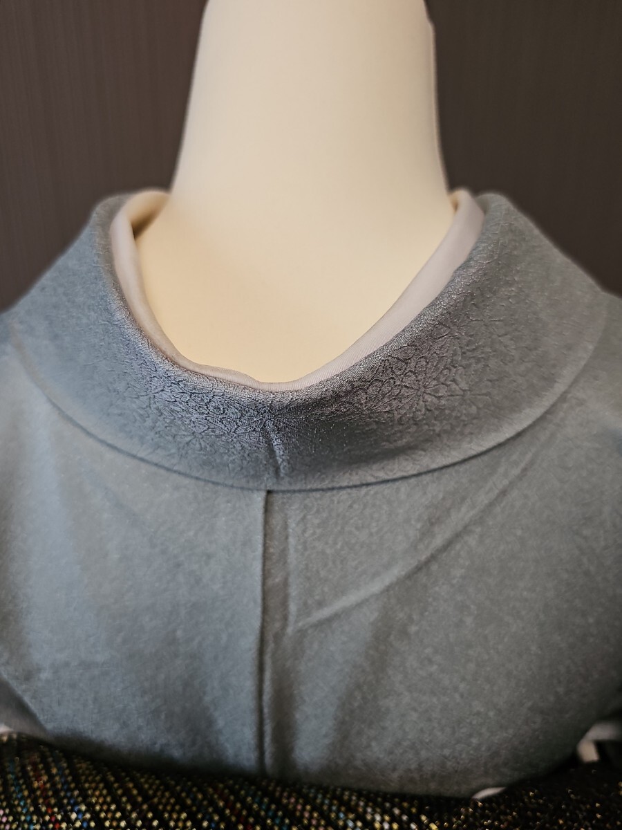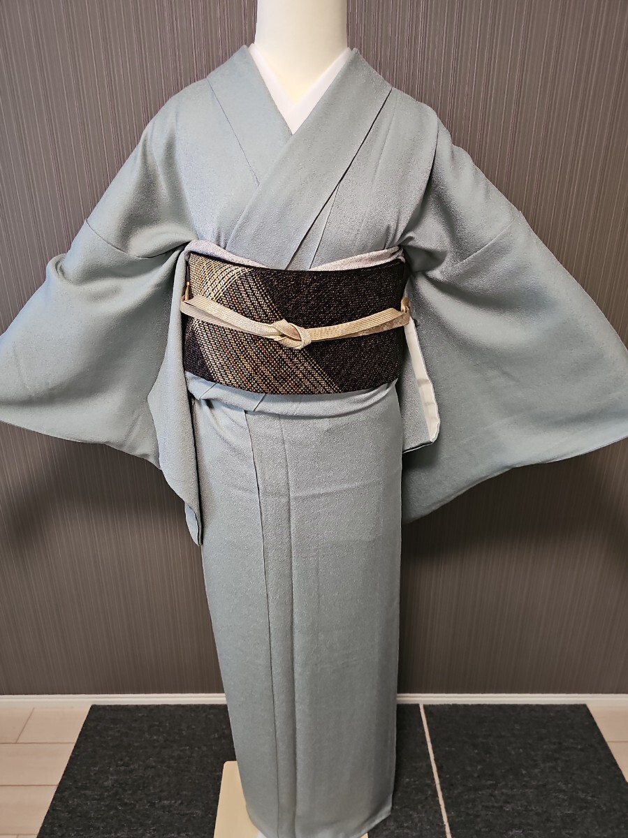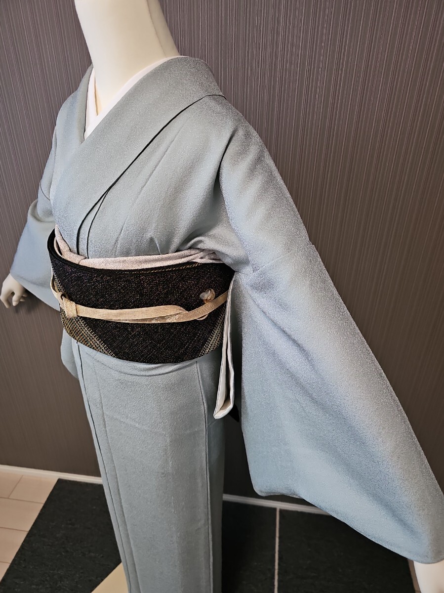 ★上質縮緬生地、菊花織地文様、青磁鼠がかった青白橡系の色味、気品有るしっとりとした美しさを醸し出す上等なお召し物でございます。