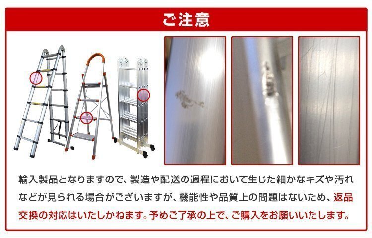 最長5mまで伸びるはしご。 伸縮自在で使用時には1段ずつの引き伸ばし可能! 必要な高さでロックできます。 車のトランクに収納可能。どこにでも運べるコンパクトサイズ! 折りたたんでもたったの17cm!収納スペースにも困らない! さらにアルミ製のパイプとダブルロックの設計で頑丈、安全! 足元の安全性パワーアップし、今まで以上に安心して作業できます! 私生活に不可欠なはしごです! 電球交換やエアコン掃除、2階~3階の外壁、洗車など様々な場面にて活躍! 【商品仕様】 最長:500cm(脚立時:250cm) 収納時:92×68cm 質量:18kg 最大耐荷重:150kg 素材:アルミ(連結部分:スチール) 【注意事項】 ・商品の重量が重く、ケガを防止するためにも、2人以上での作業をされますようお願い致します。 ・ロック状態を確認した上でのご使用をお願い致します。 ・天板部分に乗ってのご使用は危険な為、お止め下さい。 ・足元が不安定な場所などでのご使用はお止め下さい。 ・海外からの輸入製品となりますので、製造、または配送の過程において生じた、細かなキズやへこみが見られる場合がございますが、機能性や品質上に問題はないため、返品や交換の対象とはなりません。予めご了承の上、ご購入をお願いいたします。 ・商品を使用して発生した事故・トラブル・破損等につきましては一切の責任を負いかねます。 ・商品は、モニターによって色合いが異なって見える場合があります。 ・仕様・デザインは改良のため予告なく変更することがあります。 |