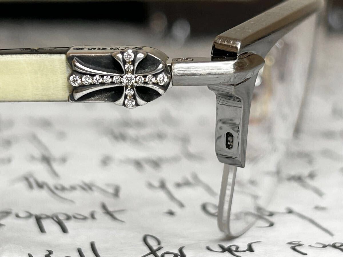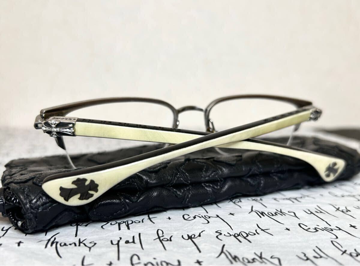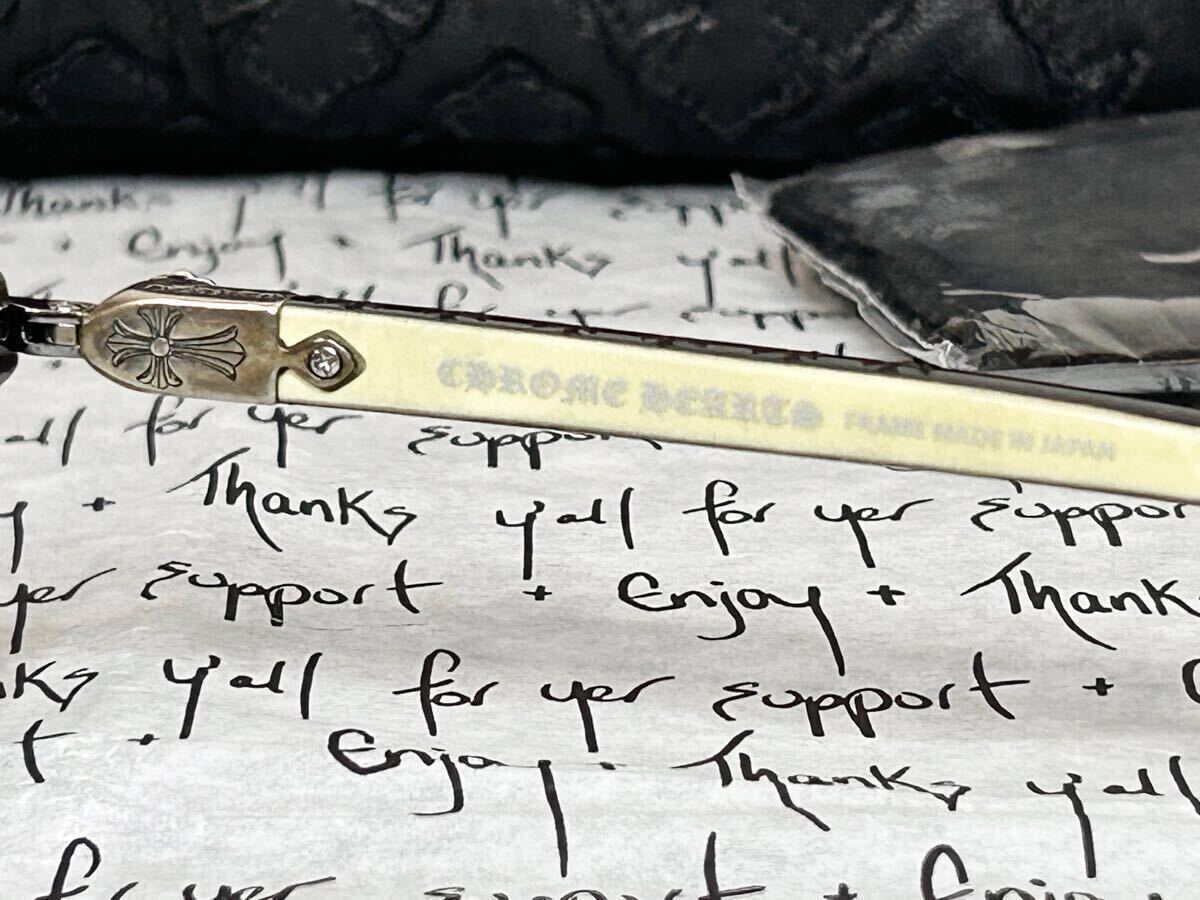 また、クロムハーツのアイウェアは派手なデザインの物が多いですが、テンプルはアイボリーに近いオフホワイトで落ち着いたデザインの為、お洒落な方に最適かと思います。