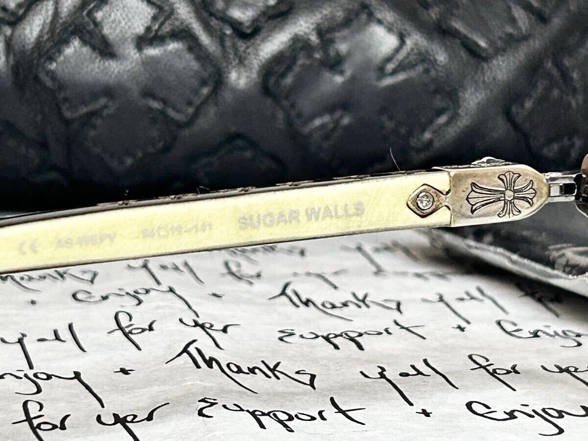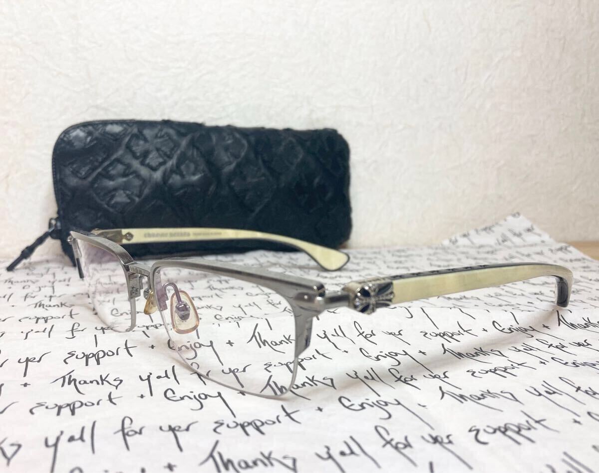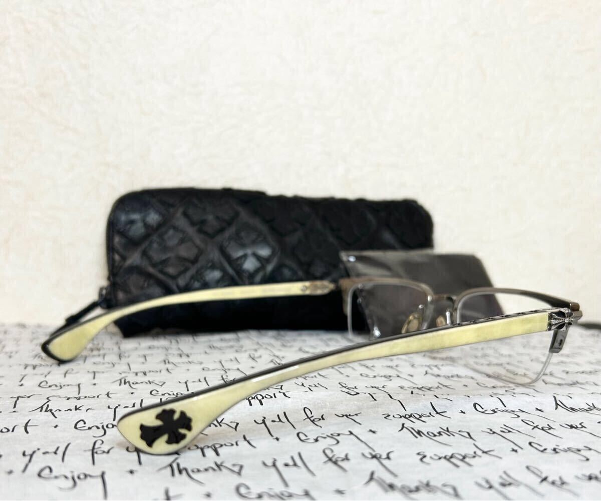 また、クロムハーツのアイウェアは派手なデザインの物が多いですが、テンプルはアイボリーに近いオフホワイトで落ち着いたデザインの為、お洒落な方に最適かと思います。