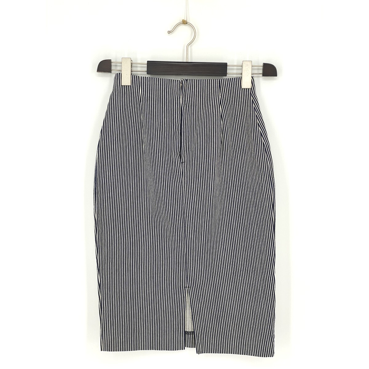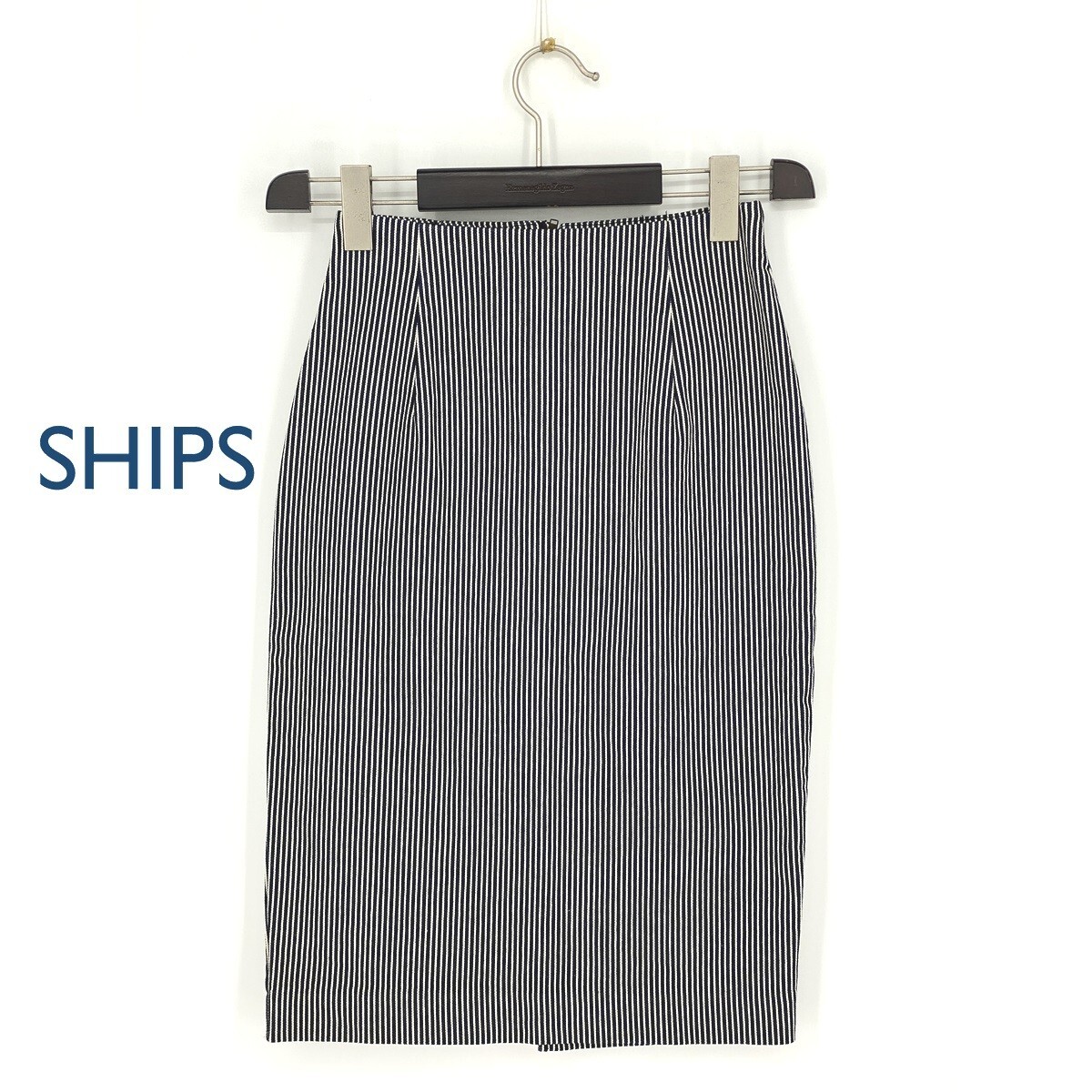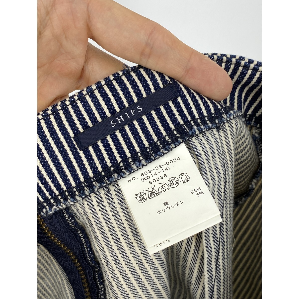 B0413/極美品 SHIPS シップス コットン ストレッチ ストライプ タイト ミモレ丈 膝丈 ヒッコリー デニム スカート S程 青 白 レディース