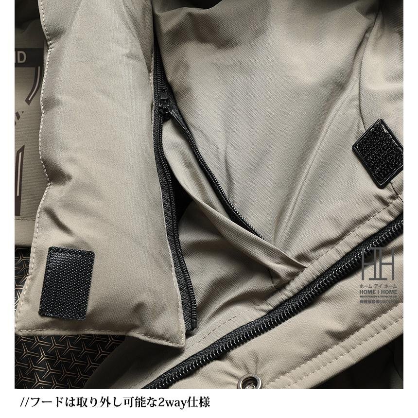 脱着式フードやボリューム感のある首元、アームのワッペンバッチ、裏の両ポケット、両サイドポケットに止水ファスナー、フロントにジッパーとボタンによる開閉など、