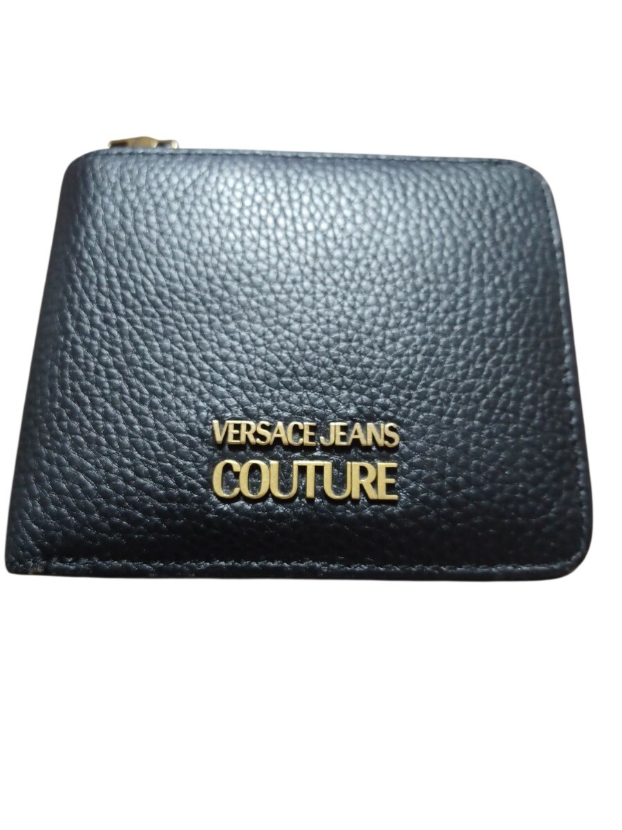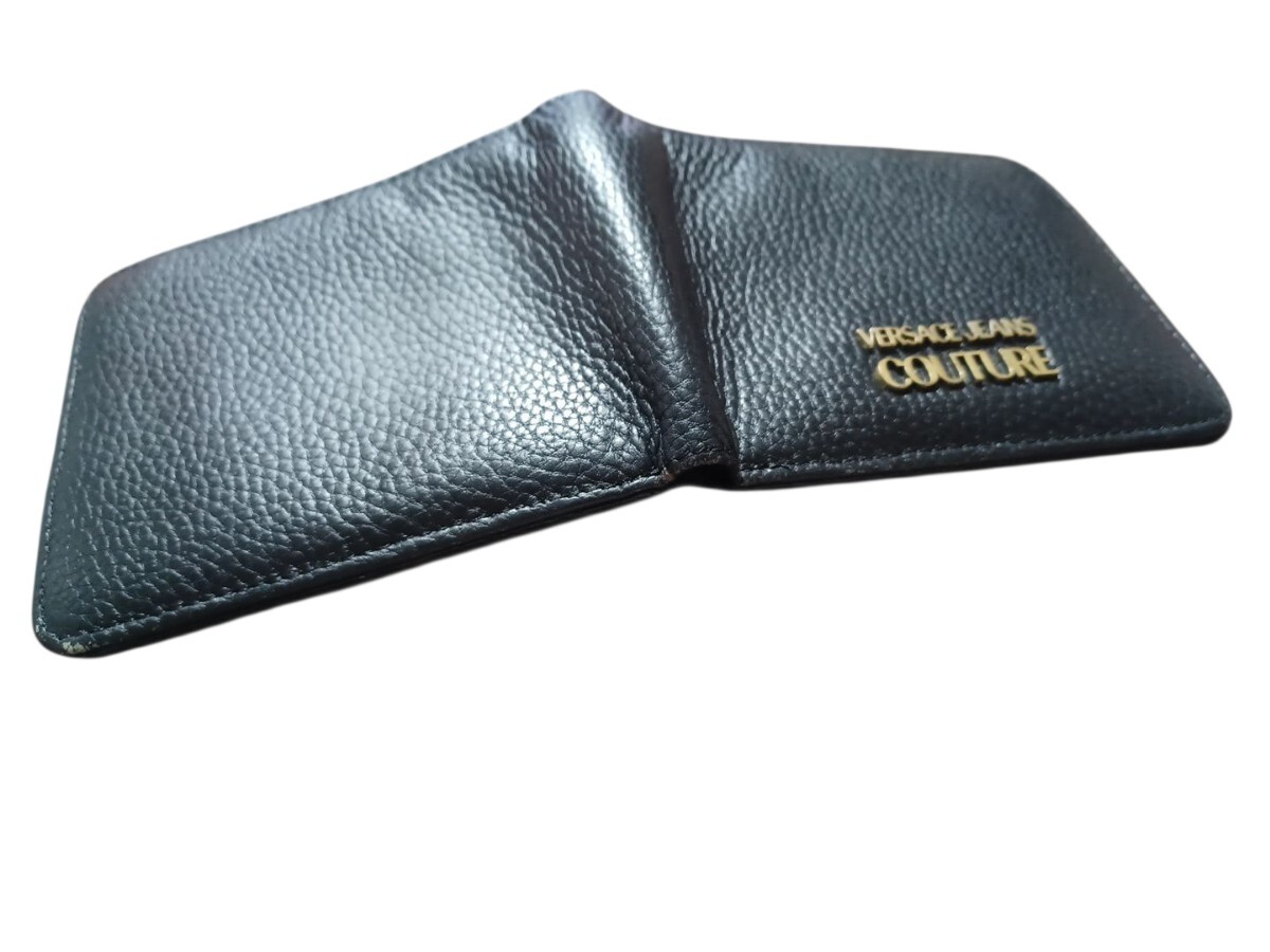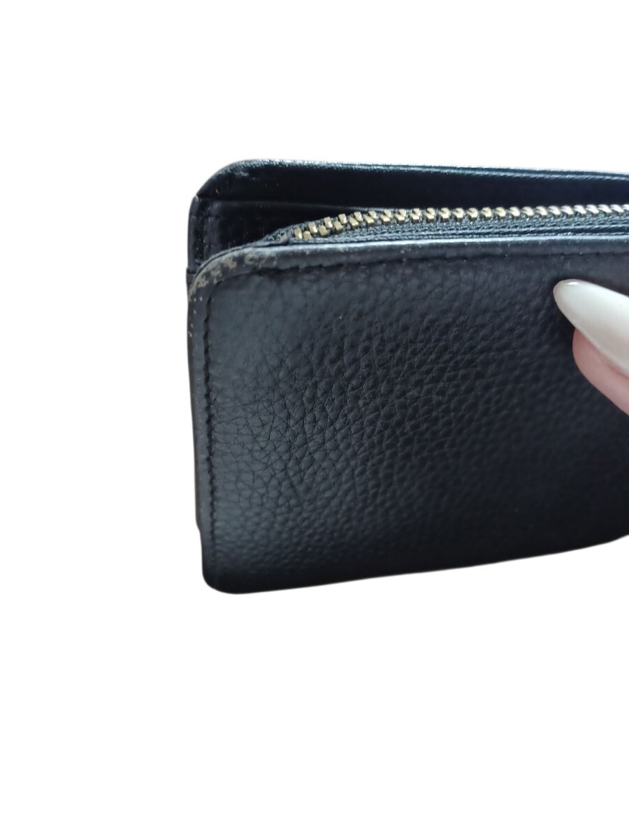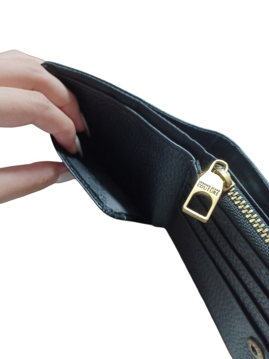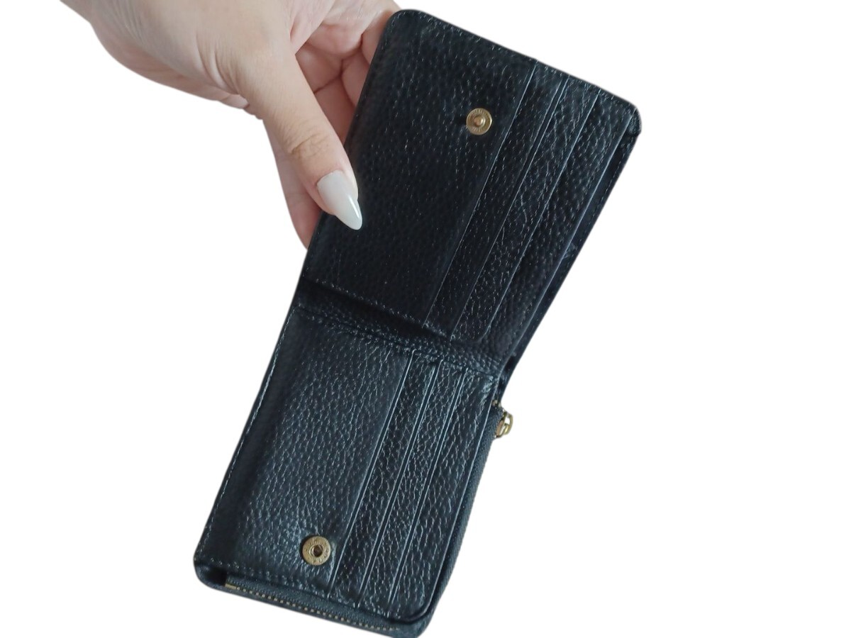 高級感のあるブラックレザーの二つ折り財布、複数のカードポケットとゴールドファスナー付き。