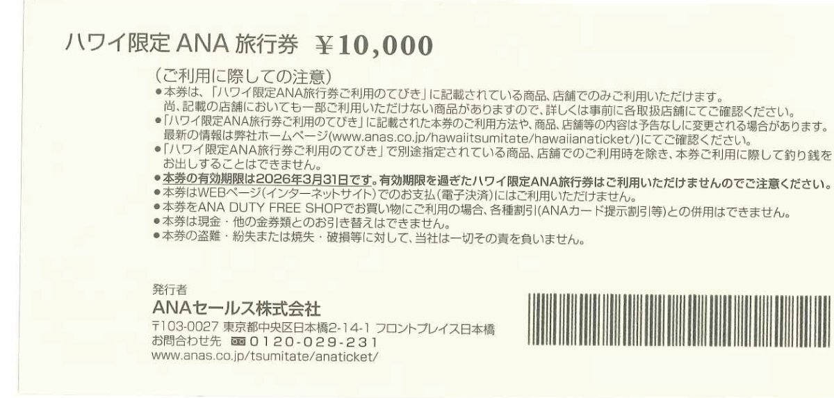 商品名:ANA旅行券 ハワイ限定 10,000円[2026年3月31日まで]