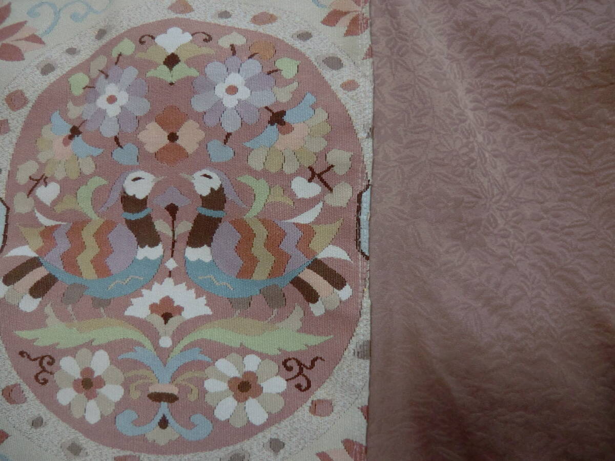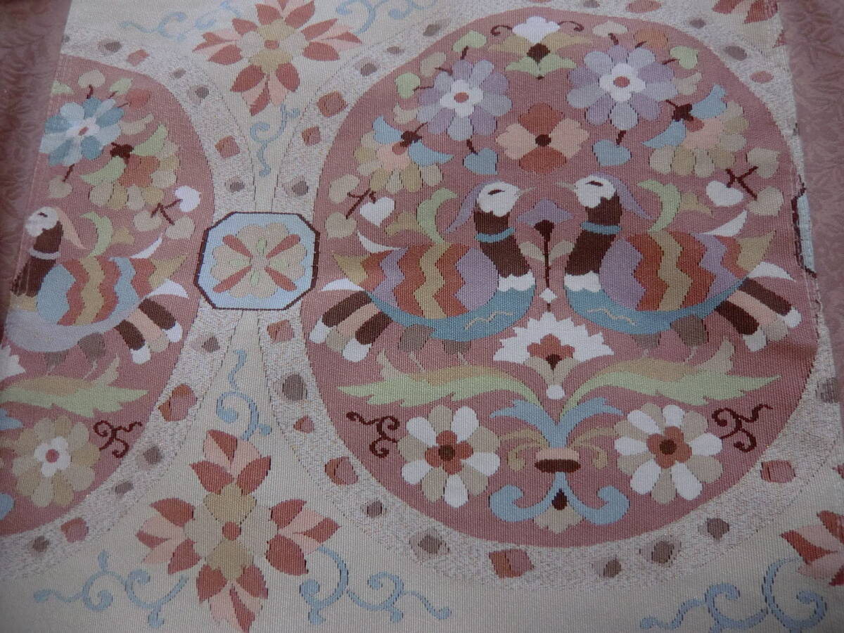 帯は生成色地に丸文に吉祥文様と向かい鳥柄です。