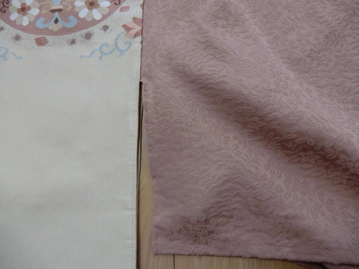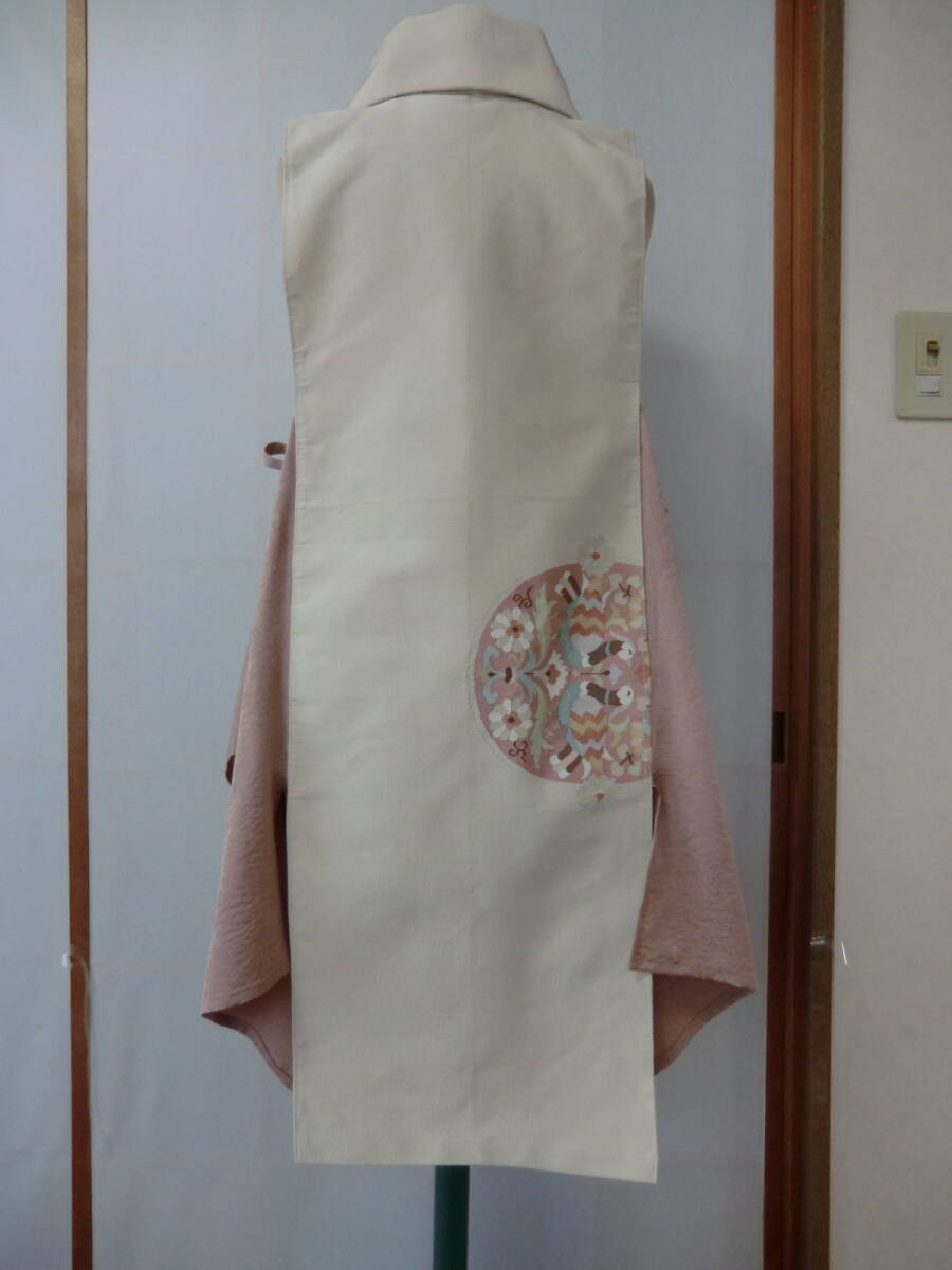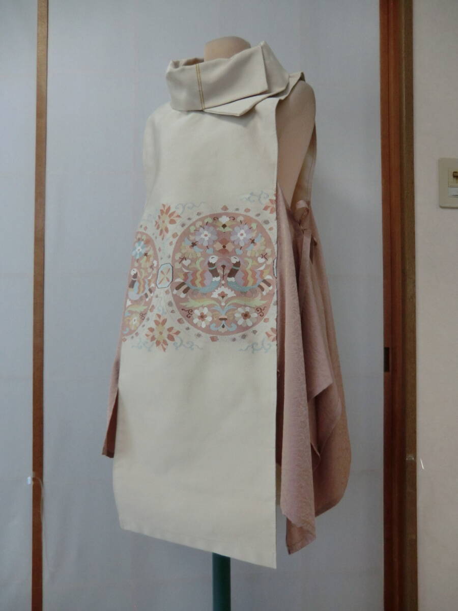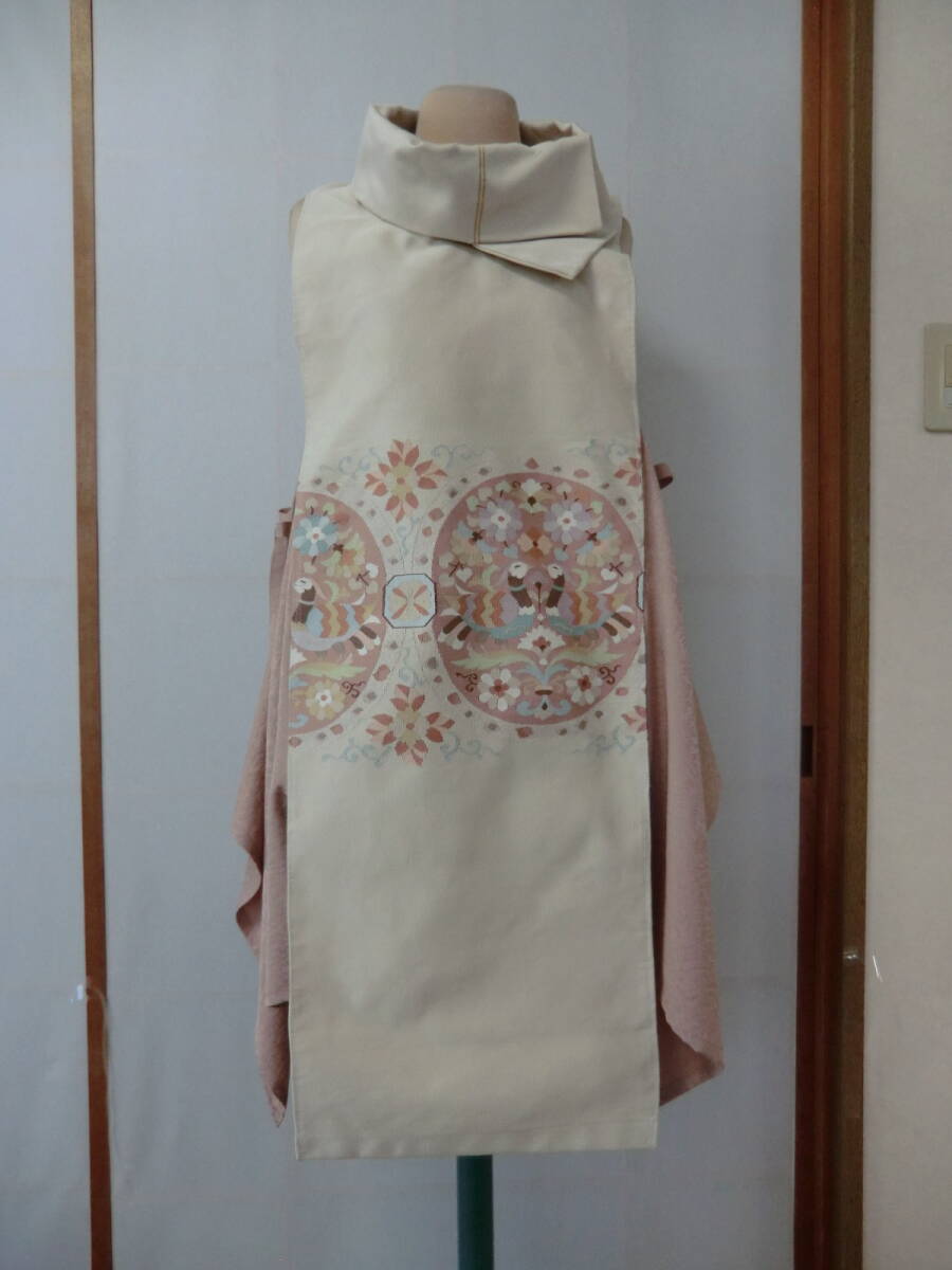 着物リメイク☆正絹 丸文に鳥柄名古屋帯 綸子無地 フリーベストチュニック☆重ね衿