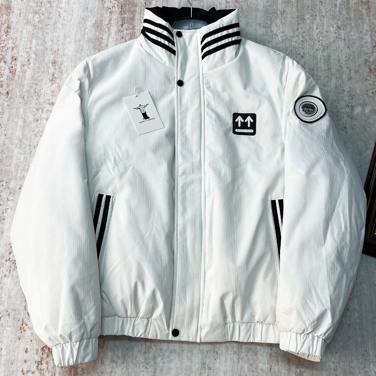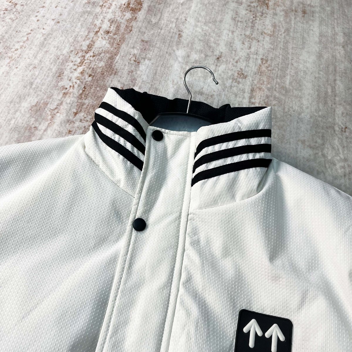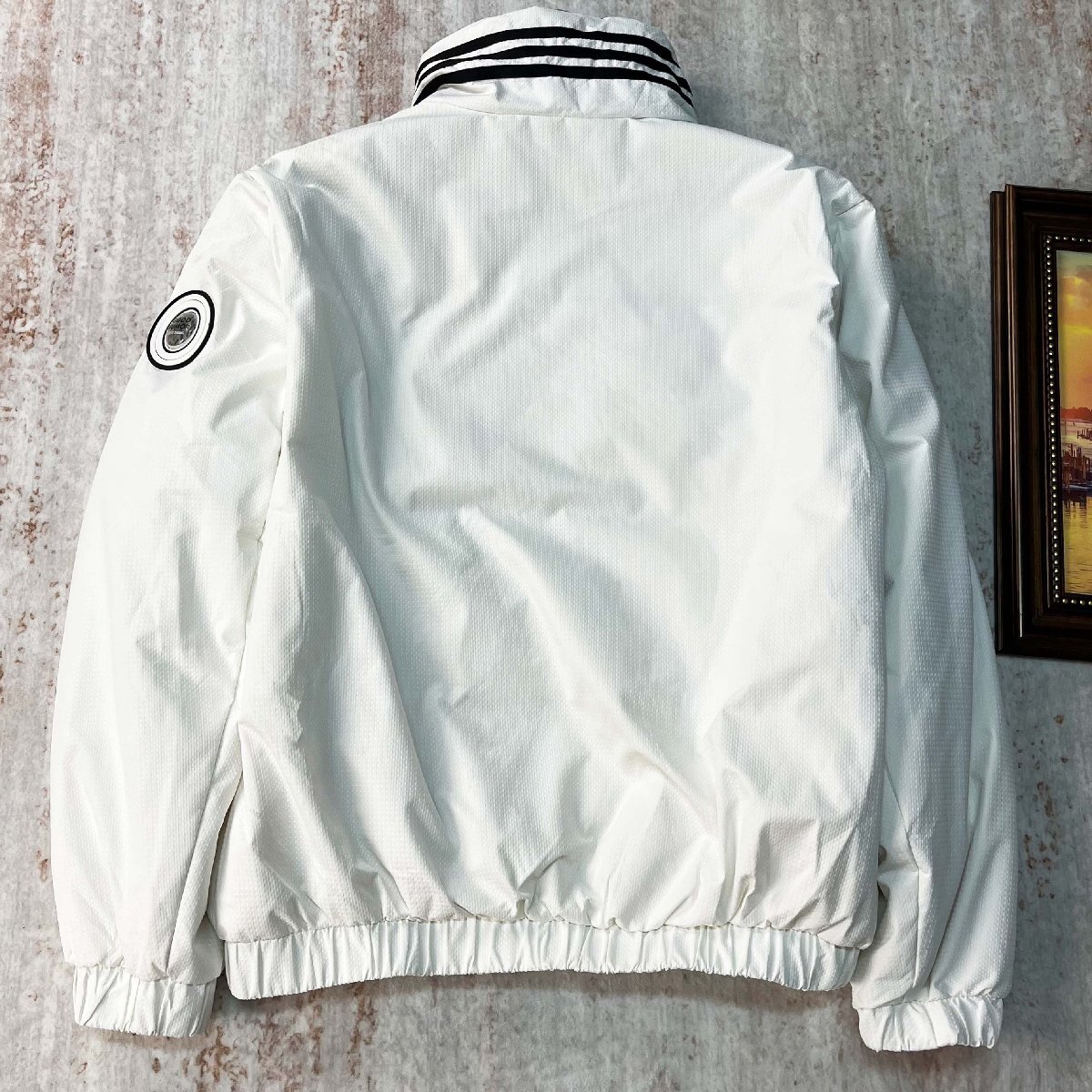 スタンドカラーに3本のラインをあしらったデザインで、首元をしっかりと覆いながらもスポーティーな印象を与えます。左胸と左袖口のロゴがアメカジ感をプラス。裾と袖口には伸縮性のあるゴム仕様で、冷気の侵入を防ぎながら、動きやすさも確保。両サイドには実用的なポケットも備えており、デザイン性と機能性を兼ね備えた仕上がりです。