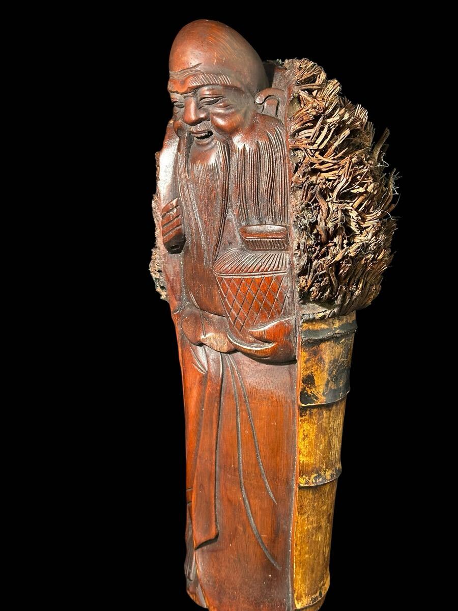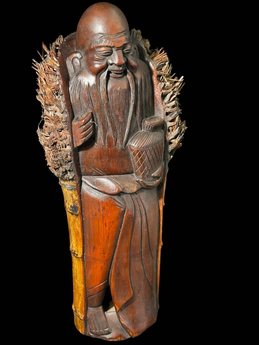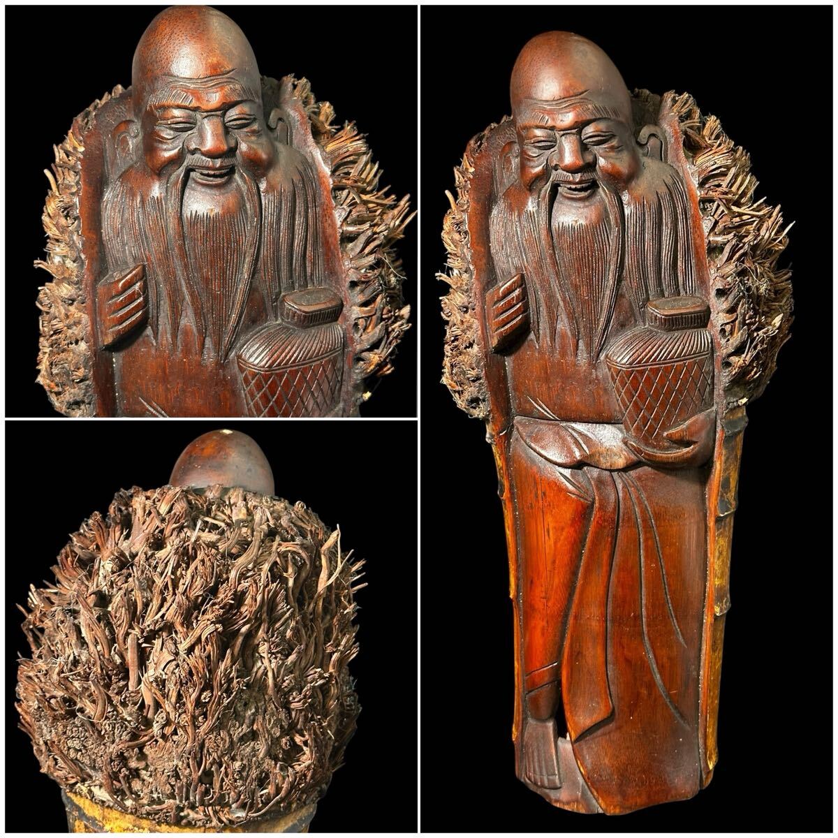【商品の説明】竹工芸 古竹 煤竹 骨董 古美術 寿老人 仙人 七福神 一刀彫 時代物 民藝 古物 (41×18×12cm)
