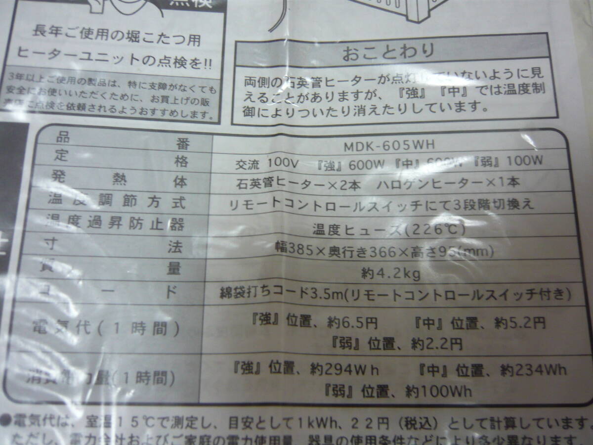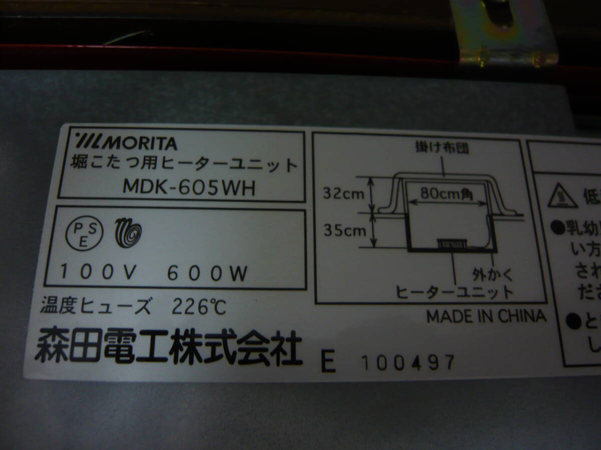 堀こたつ用ヒーターユニット【森田電工 MORITA / MDK-605WH】中古