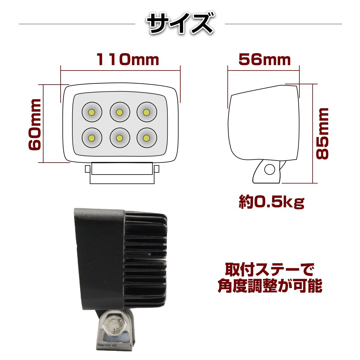 3WパワーLEDを6発搭載し、しっかり路面を照らす明るさを実現 IP67の防水・防塵性能を備え素材はアルミ合金の為、高耐久で長持ち 取付はプラスとマイナスの2本の配線を電源に直接つないでボルトで固定するだけ 固定用ステー、ボルトも付属しているので、そのまま簡単に取り付け可能です ■様々な用途で大活躍 ・車に取り付けてフォグランプやバックランプに ・バイクのヘッドライトだけでは心配な夜間走行の補助灯に ・トラックに取り付けて路肩灯や夜間作業の補助灯として ・船に取り付けて夜間作業用の投光器や集魚灯として ■商品サイズ:110mm×85mm×56mm ■重量:0.5kg ■入数:2個セット ■動作電圧:DC10~30V ■色温度:約6000K ■保護等級:IP67 |
