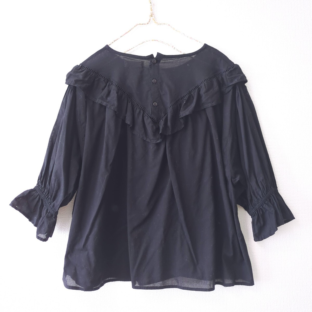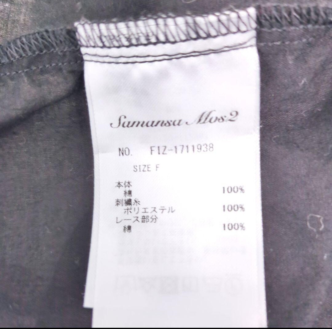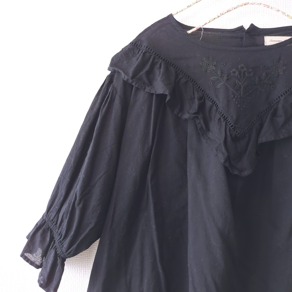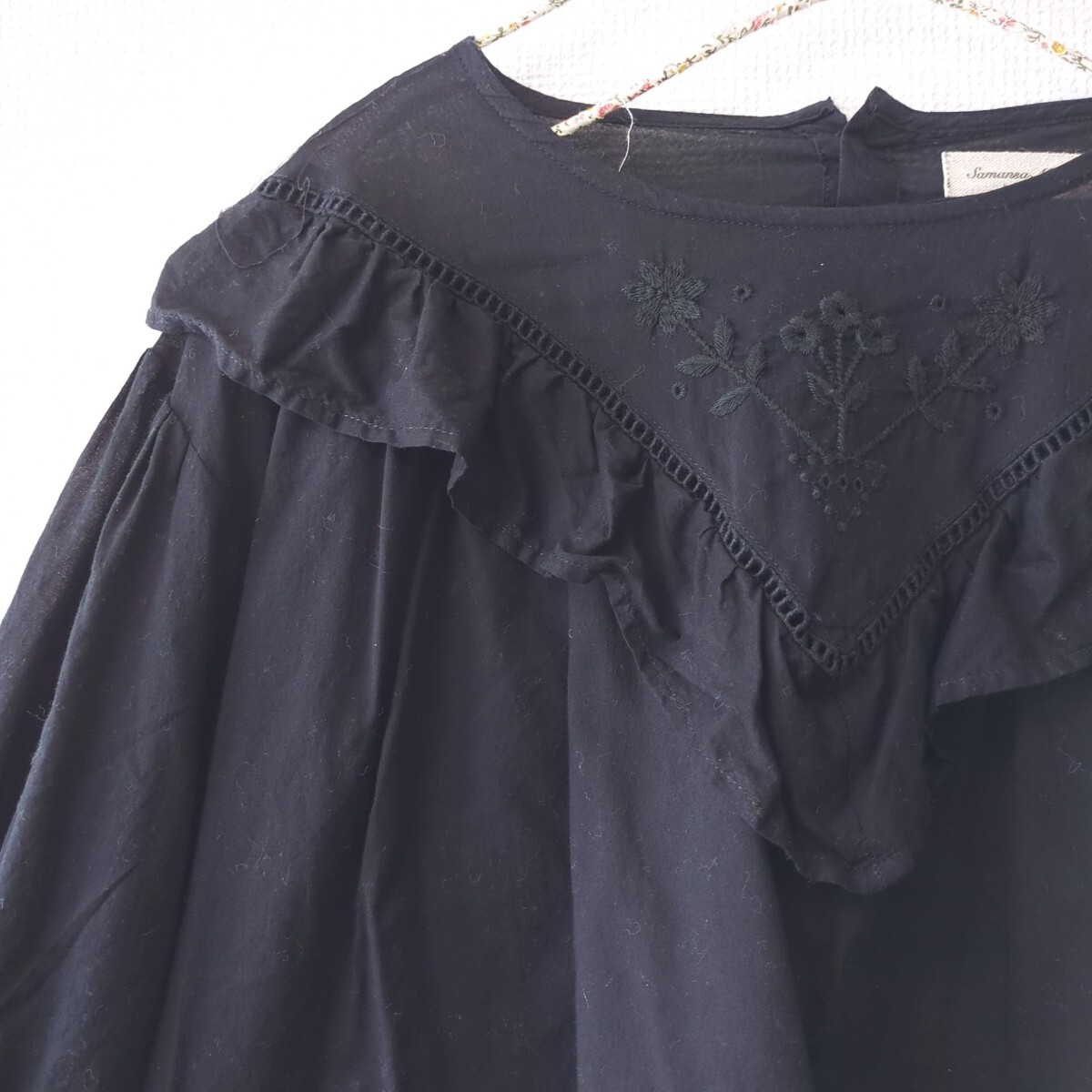 美品 Samansa Mos2 サマンサモスモス 襟フリル刺繍五分袖ブラウス 黒 春夏