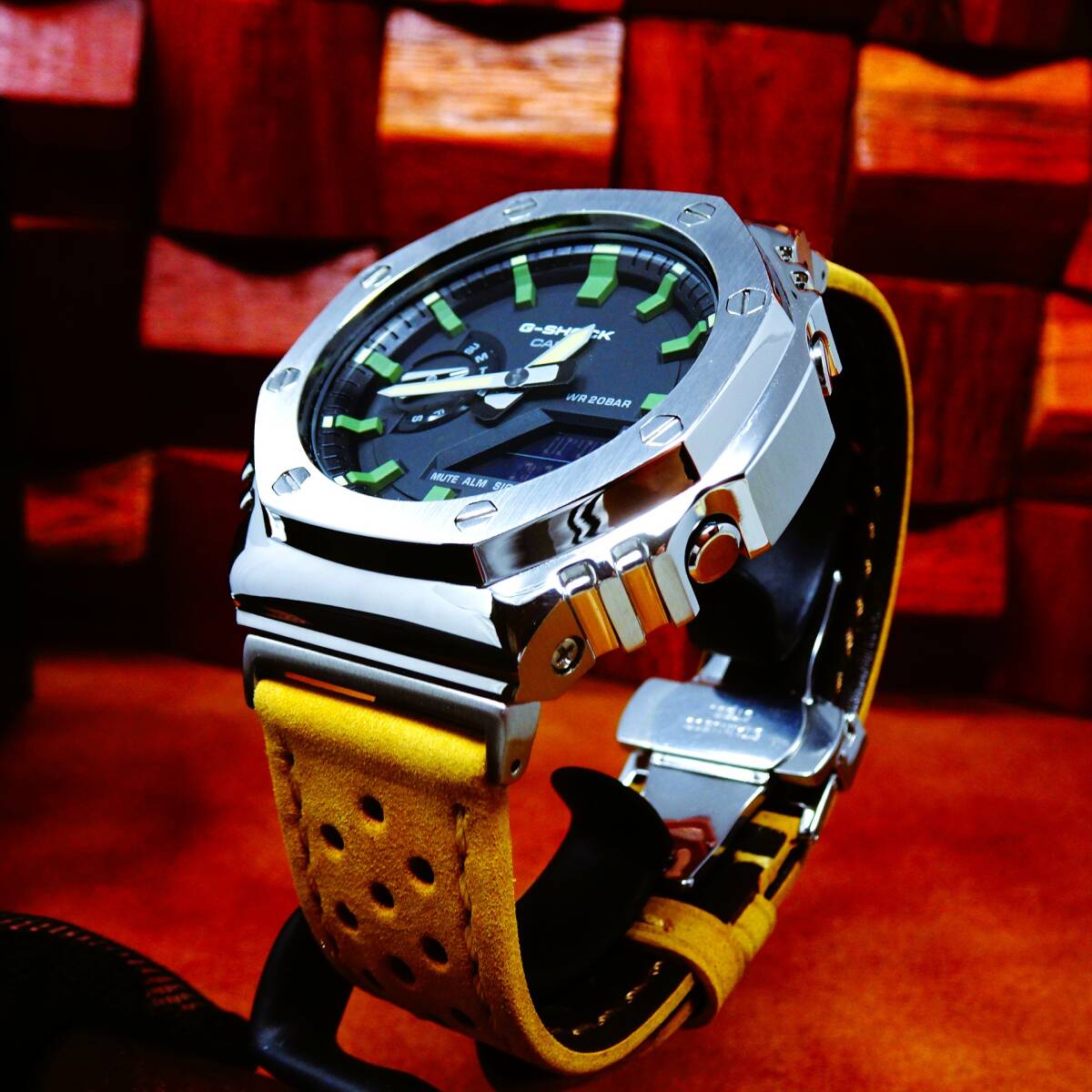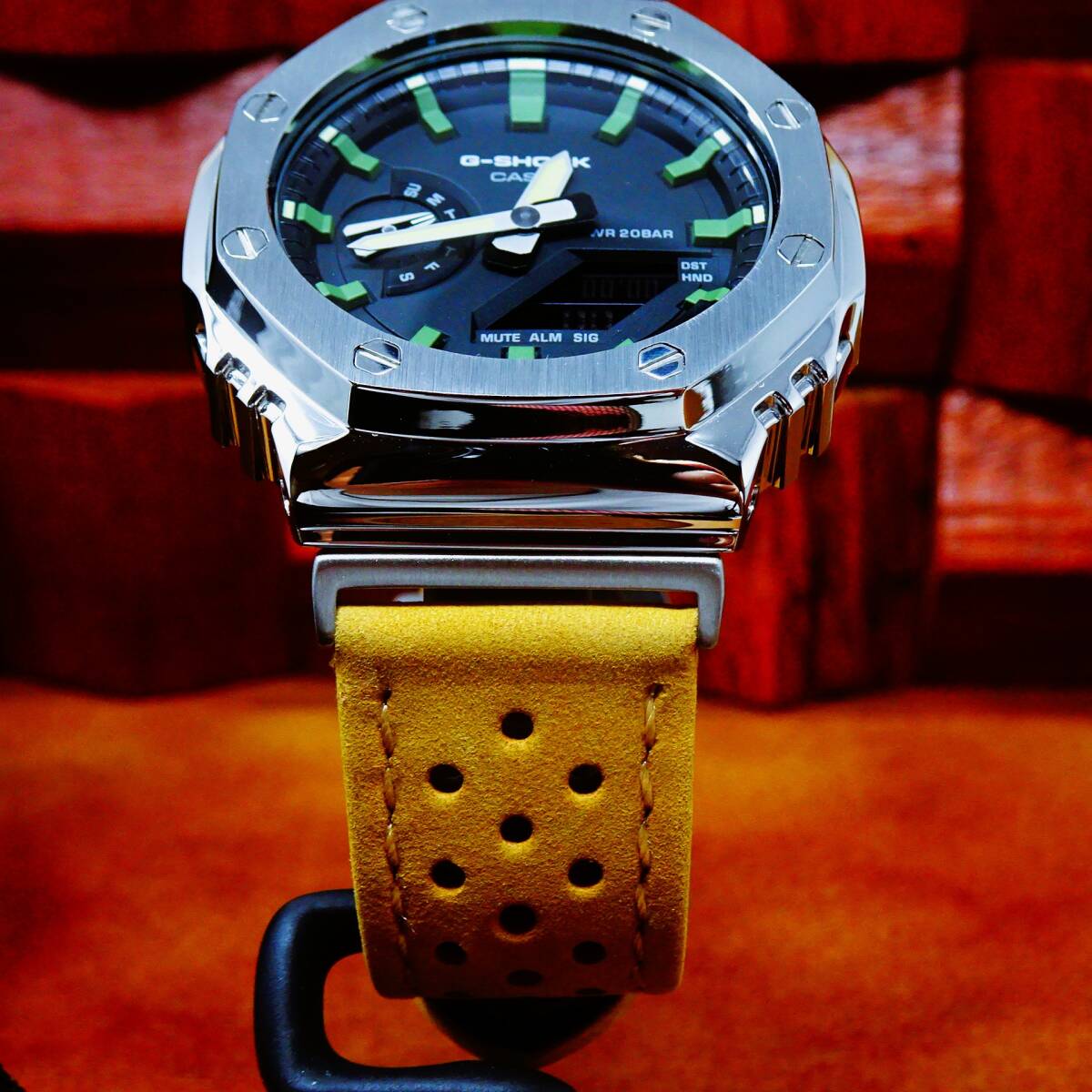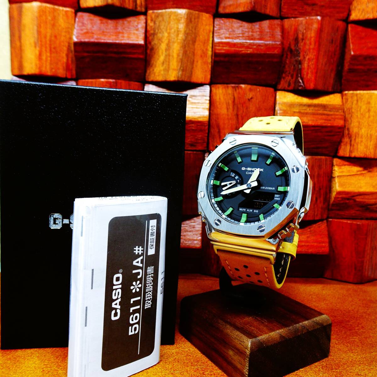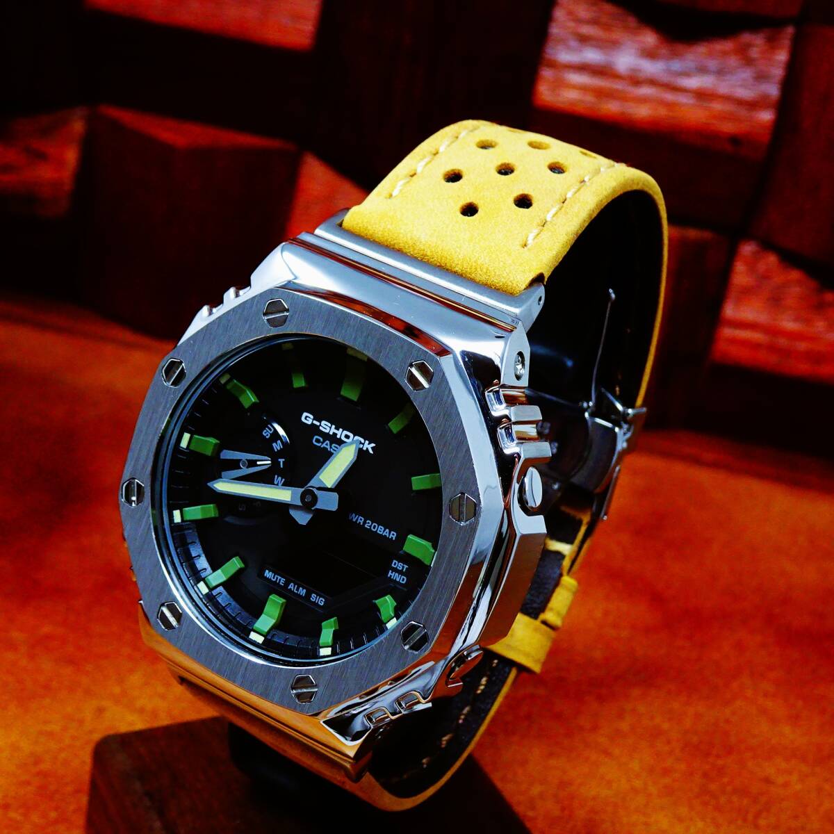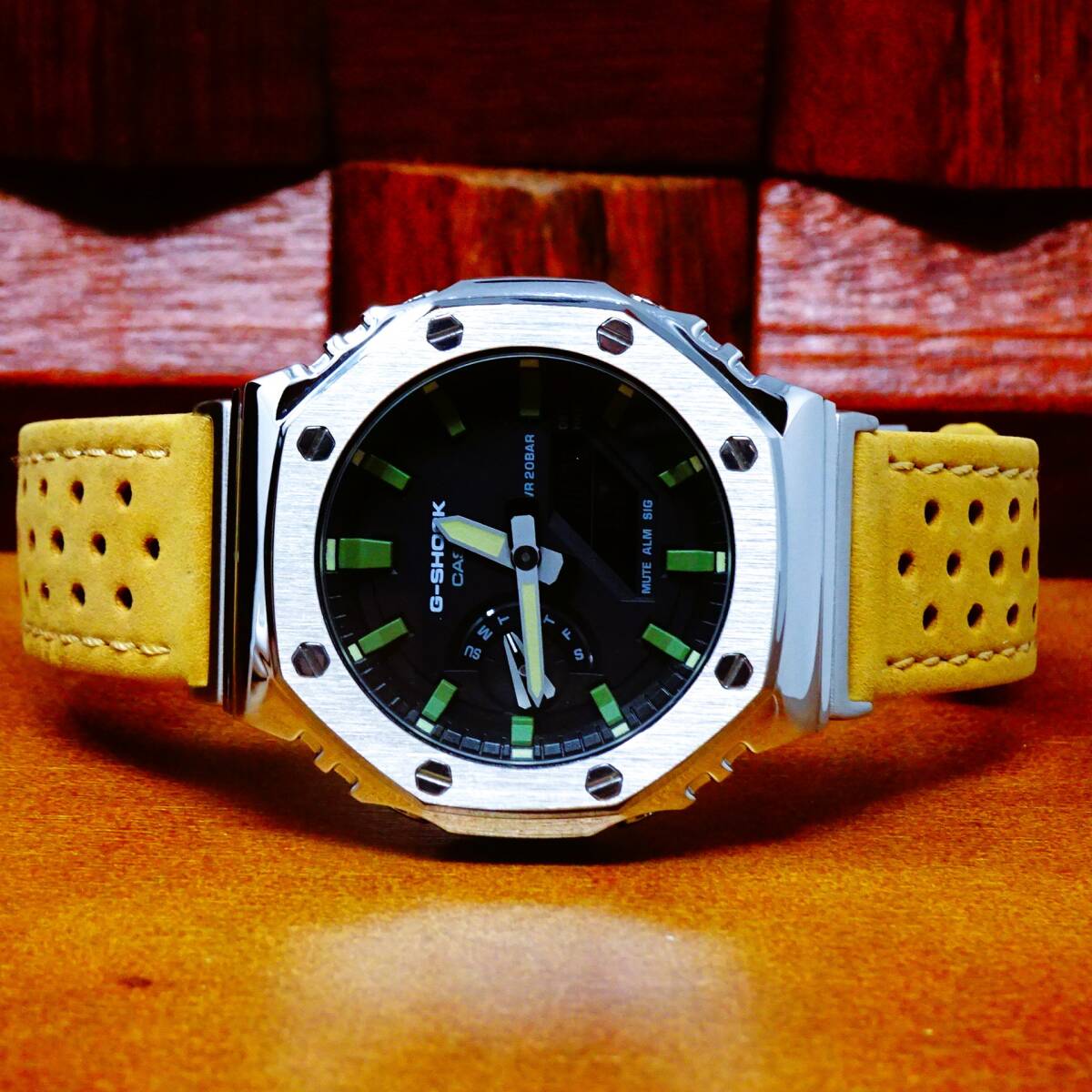 〓新品〓GショックMODカスタム〓本体付きGA2100〓ステンレス製シルバーベゼル&ベージュ色本革レザー腕時計〓カシオーク〓