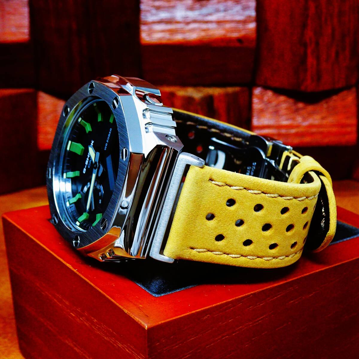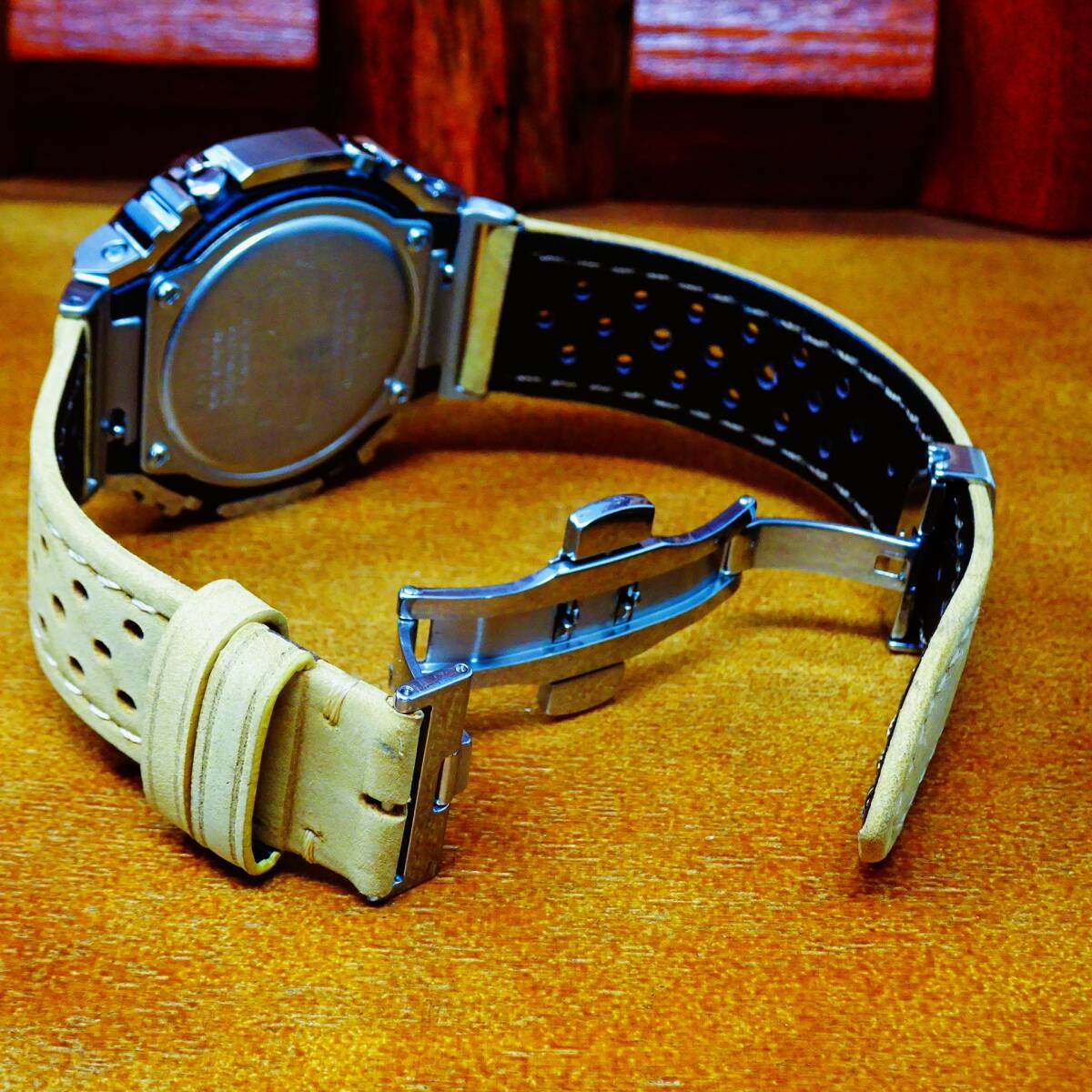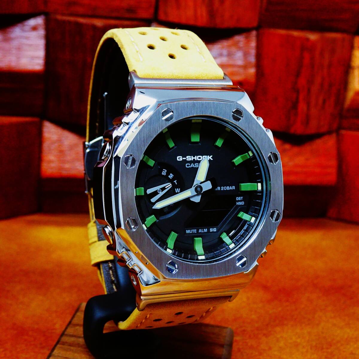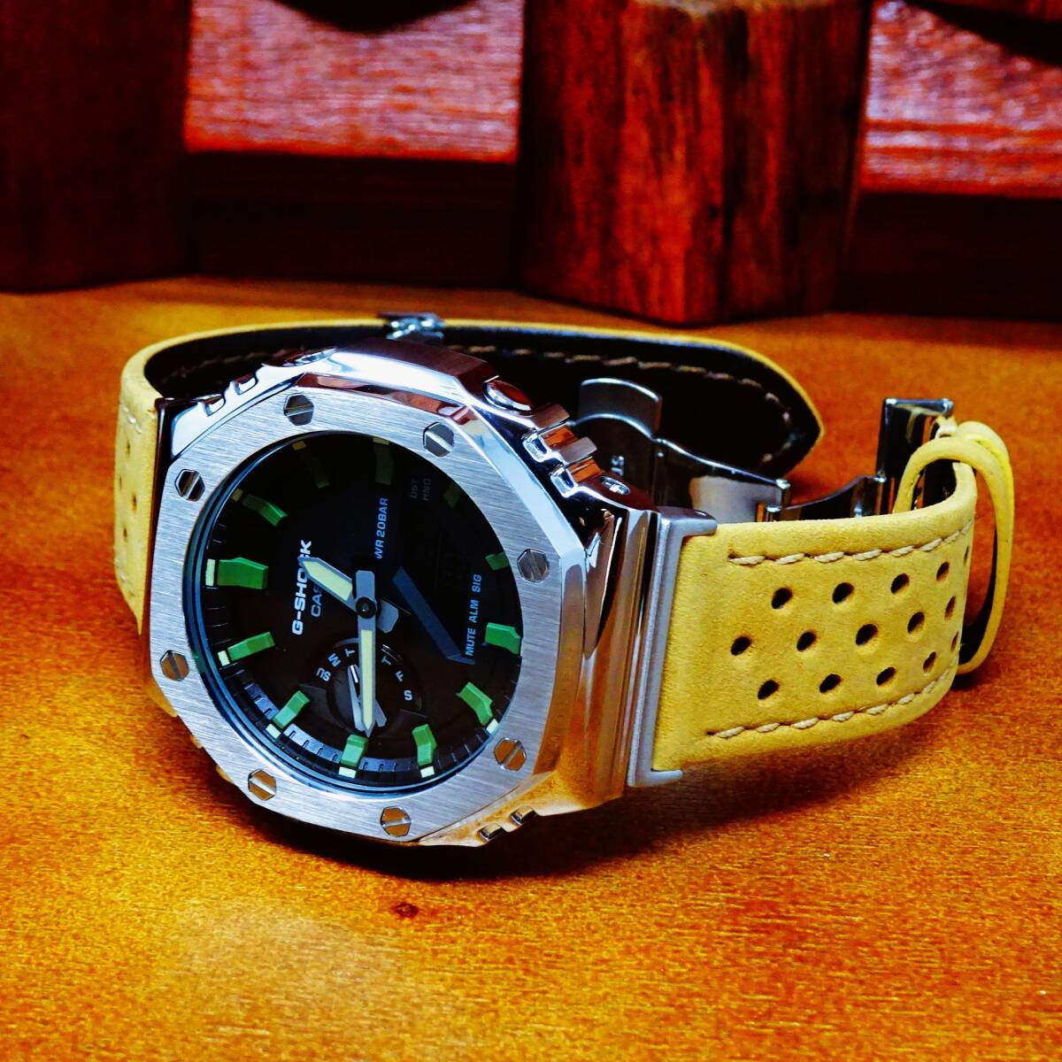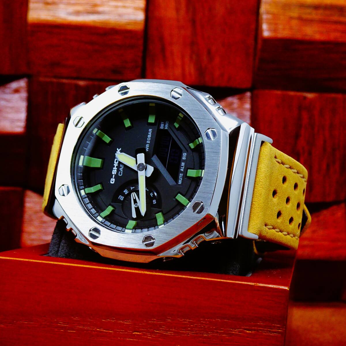 〓新品〓GショックMODカスタム〓本体付きGA2100〓ステンレス製シルバーベゼル&ベージュ色本革レザー腕時計〓カシオーク〓