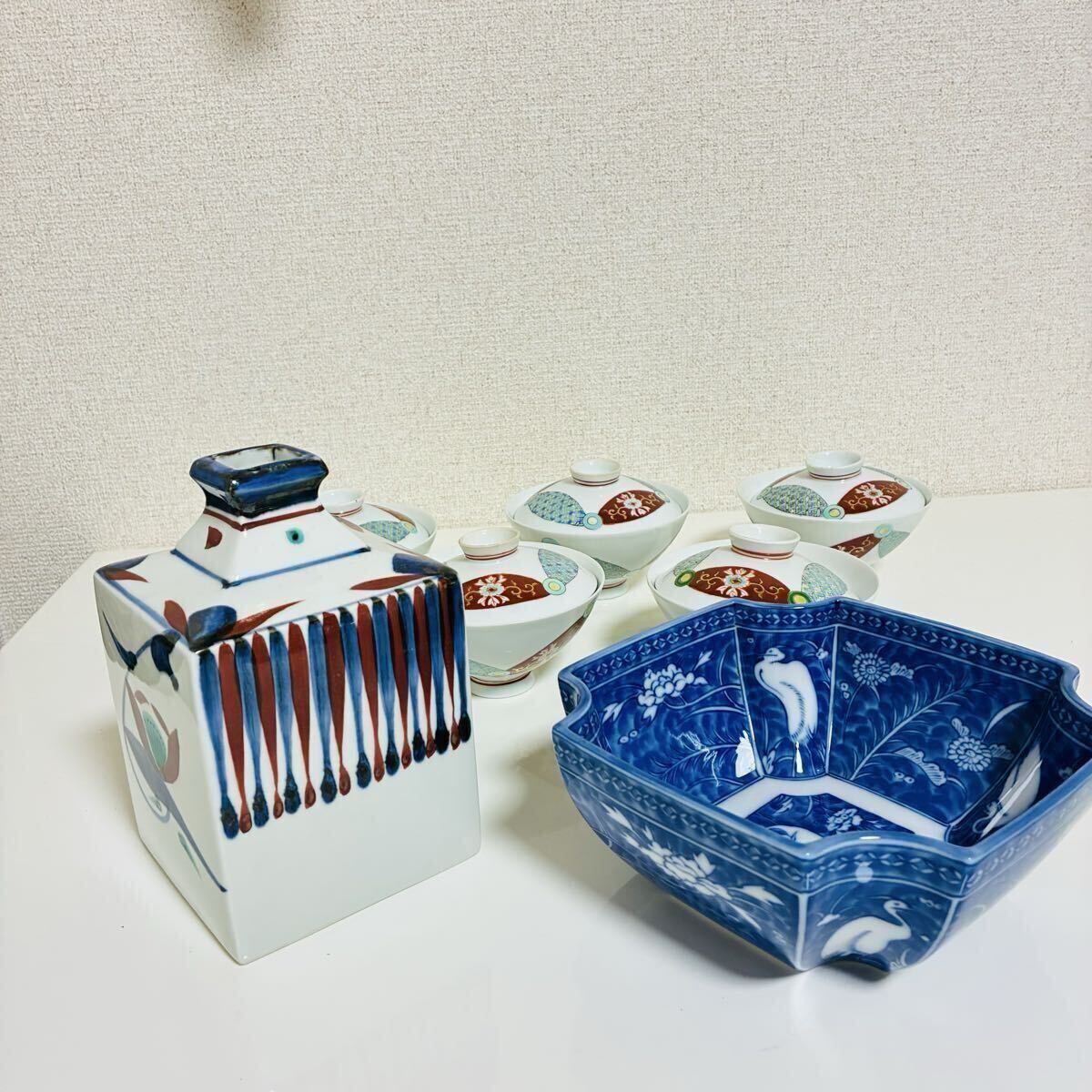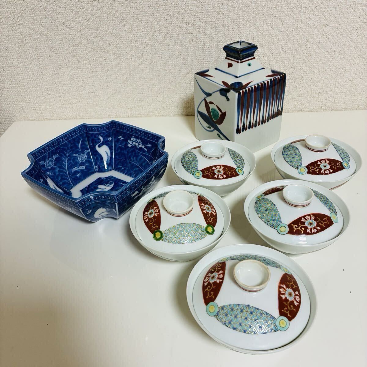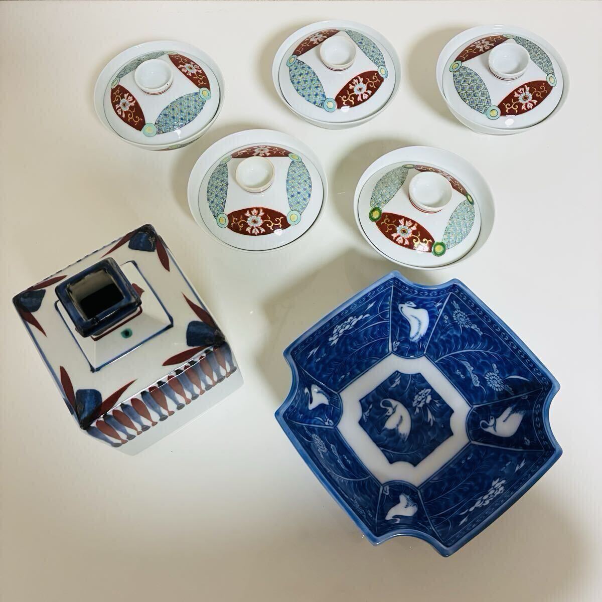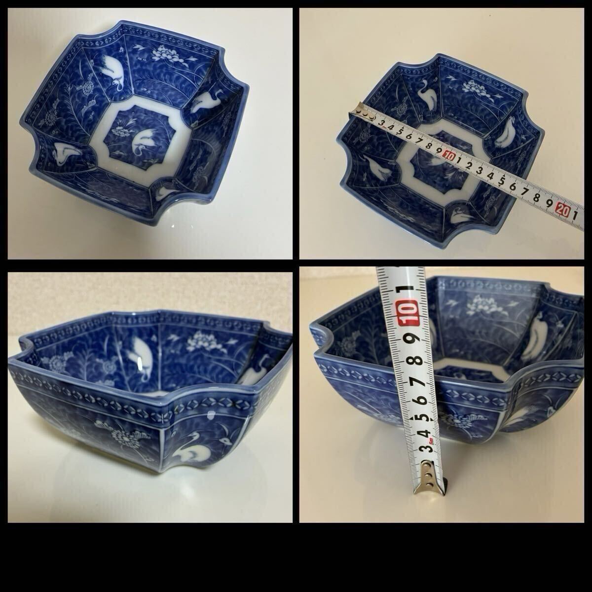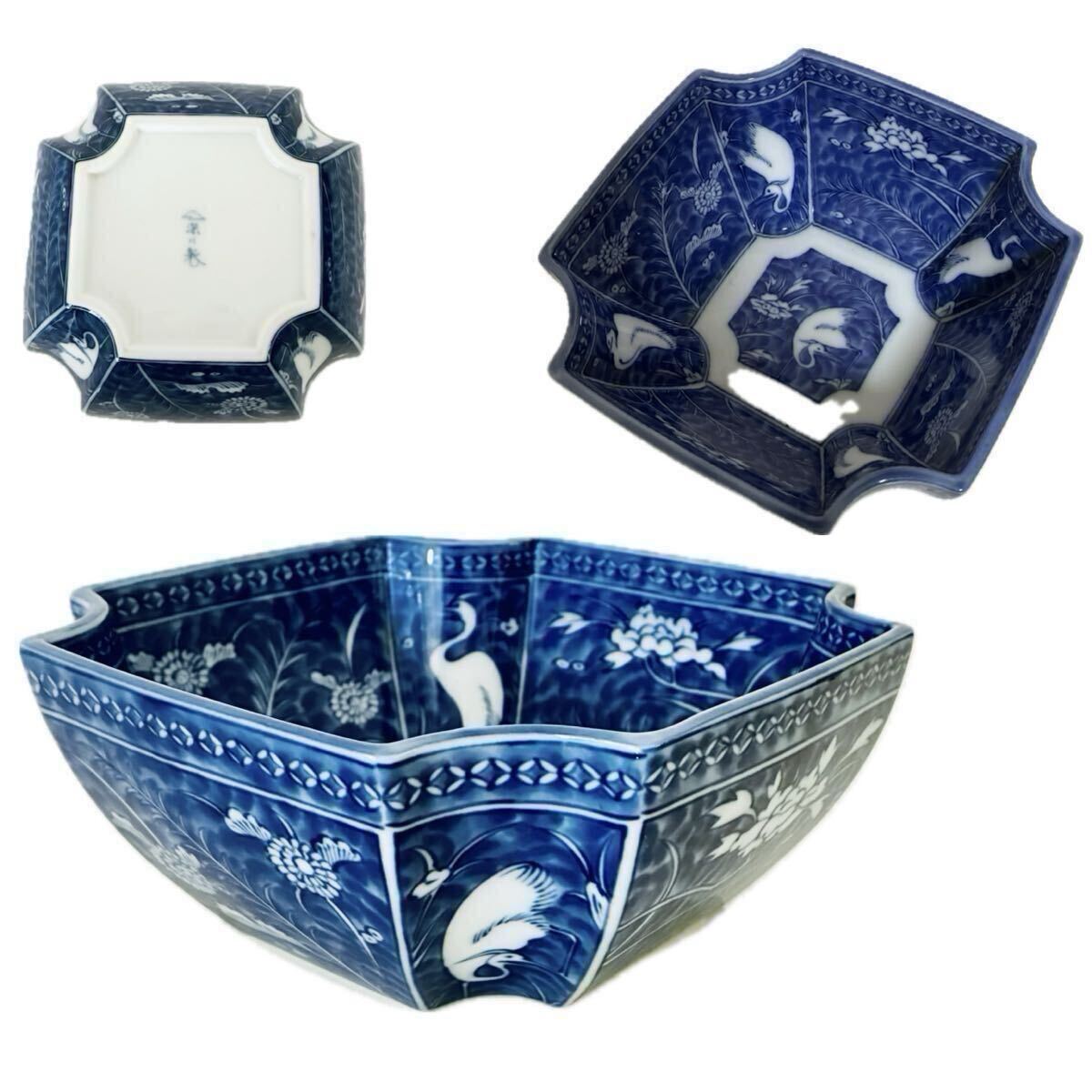 白鷺 染付 四方隅切り鉢 深鉢 盛鉢 宮内庁御用達 ブルー&ホワイト 色絵 蓋もの 五客 一輪挿し