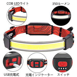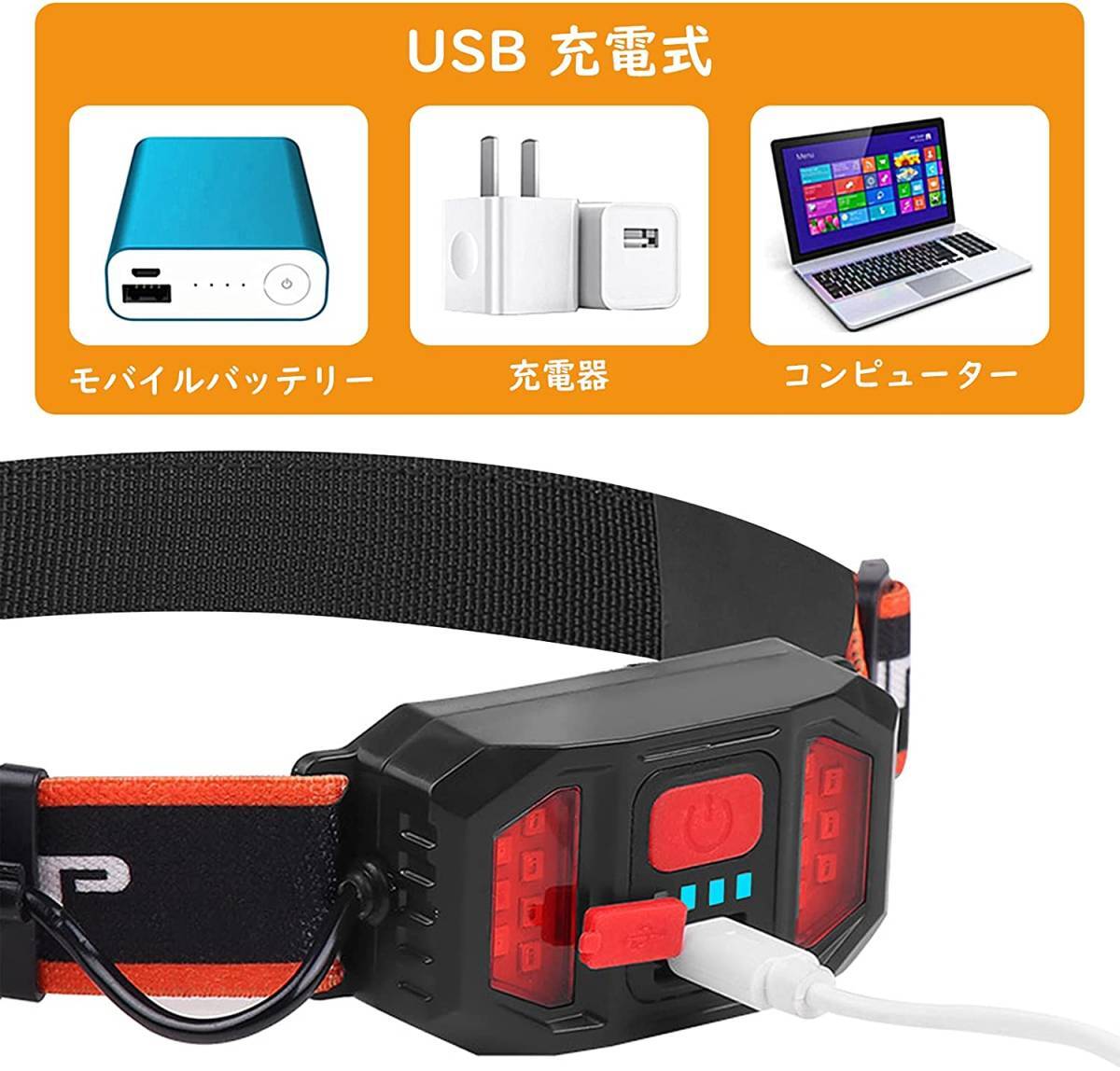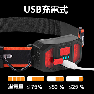 【USB充電式】1000mA大容量USB充電式バッテリーを内蔵しており、ヘッドライトは長時間の連続使用に可能です。4つのディスプレイでバッテリーの電量が表示されますが、電量が不足の時、充電が通知します。