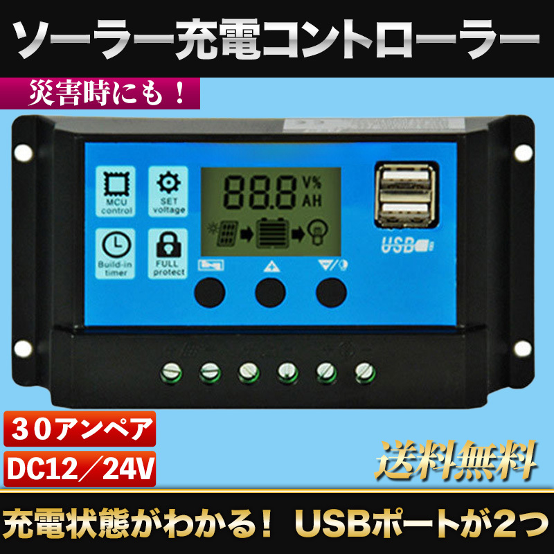ソーラー充電コントローラー 30A 12V 24V ソーラーチャージコントローラー USB2ポート付き LCD 液晶 自動調整機能 太陽光パネル 災害時にも