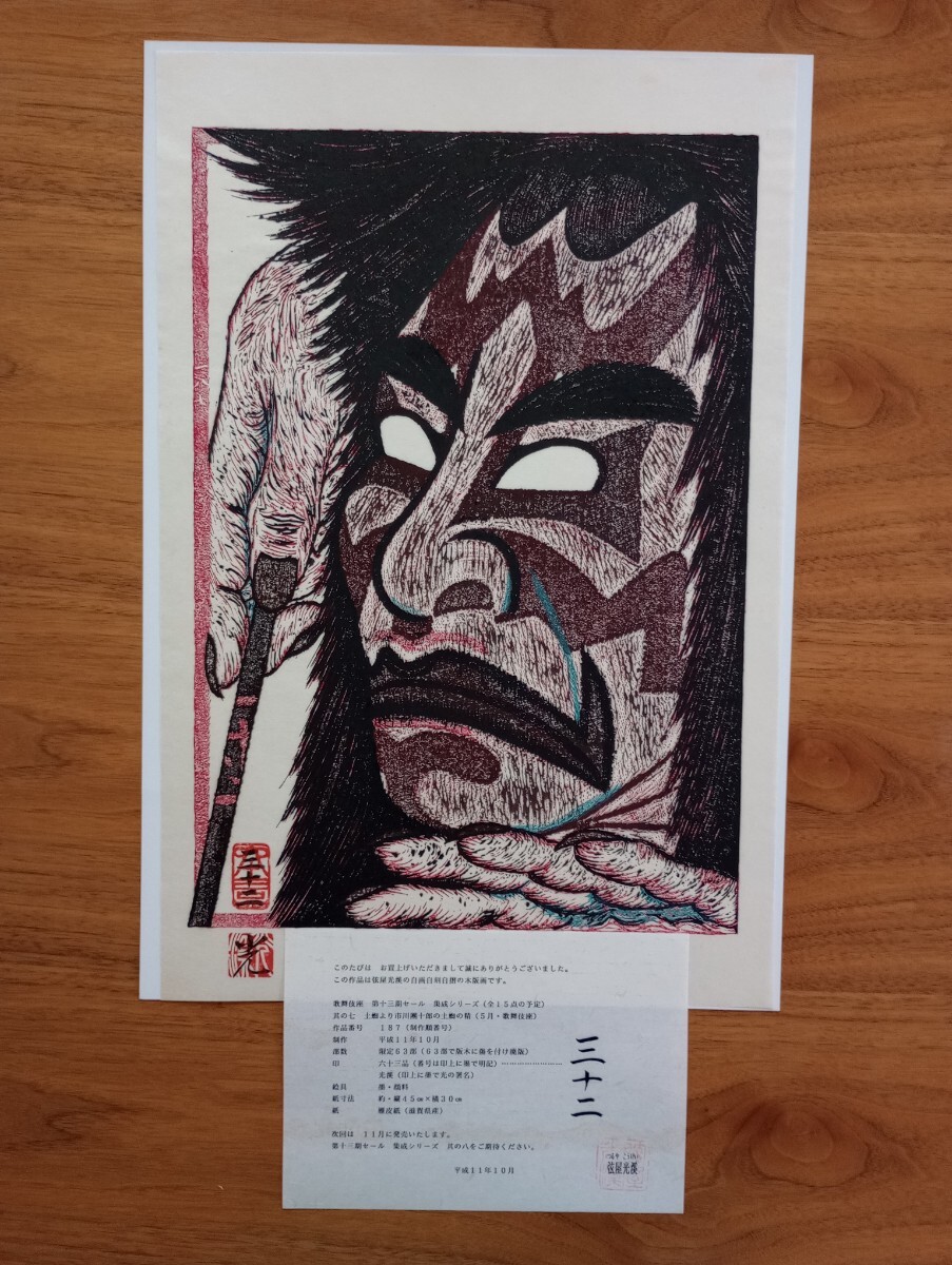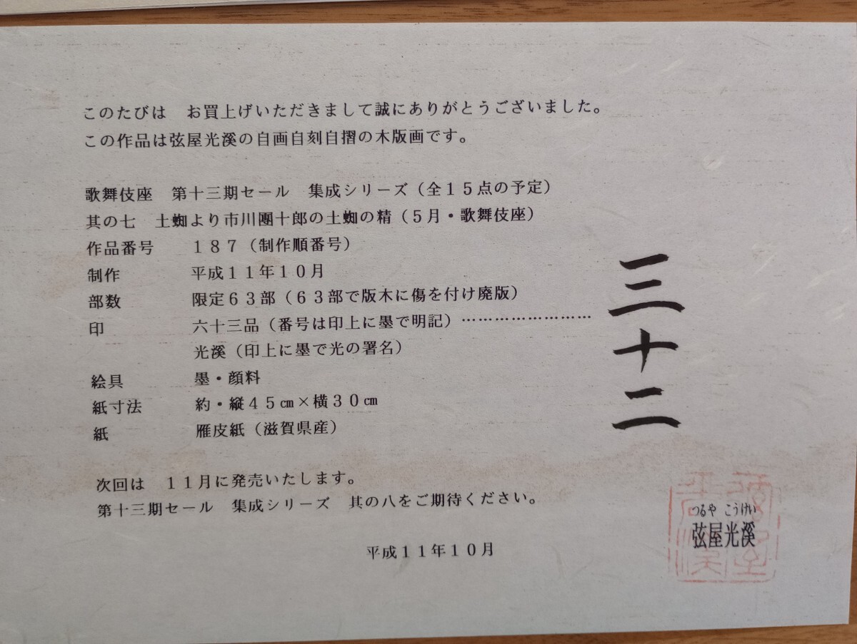 【真作】作品番号 187 作品名 「土蜘」より十二世市川團十郎の土蜘の精 シリーズ 第十三期集成シリーズの7 限定部数 63 制作年 1999/10 使用印 六十三品(印43)・光溪(印42) 紙寸法 47.5×31.5cm・(絵画部分)40.0×28.0cm 使用紙 近江雁皮紙(滋賀県産) 使用版木 朴 対象舞台 歌舞伎座「土蜘」1999年5月 販売場所 歌舞伎座内、1999年10月15日~26日 返品返金について ■こちらは真作ですが、万が一、公定鑑定人または公定鑑定機関により真作でないと判断された場合には、落札代金と送料を全額返金させていただきます。 ■該当商品の返送、鑑定書または作家の署名・捺印・日付の入った書面のご提出をお願いいたします。 (画廊・第三者・個人による鑑定は保証対象外となります。) ■返品に際しては、出品時の画像および発送時と同一の状態であることが条件となります No. 187 Title Ichikawa Danjuro XII as the spirit of the spider in Series title Culminant Series XIII (Design 7) Edition 63 Date 1999/10 Seal (Seal 43); (Seal 42) Dementions 47.5×31.5cm・(絵画部分)40.0×28.0cm Paper Omi Ganpi paper (made in Shiga Prefecture) Woodblock Magnolia Obovata Subject performed at the Kabuki-za, 1999/5 Sales location Kabuki-za; 1999/10/15 to 26