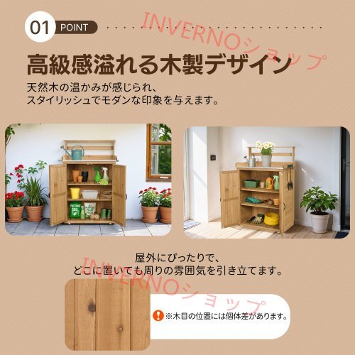 • ◎01【自然に馴染む木製物置き】自然な木の風合いと高い機能性を兼ね備えた物置きです。庭やベランダにぴったりのサイズ感で、大切な道具をしっかり収納できます。シンプルでありながら温かみのあるデザインは、どんな空間にも自然に溶け込みます。