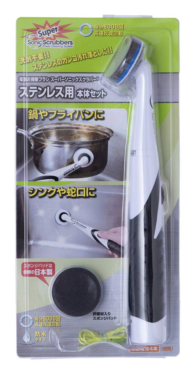 ●毎分8,000反復回転する電動お掃除ブラシ「スーパーソニックスクラバー」のステンレス汚れ落とし用の機能的なモデルです。パッドはお届け時に計4枚付属します。●ステンレス汚れ落としに絶大な威力を発揮する国産機能パッドを合計4枚付属し、頑固な汚れや焦げ付きを洗剤なしでらくらく時短で落とします。●ステンレスのフライパン・鍋・やかんなどの頑固な焦げ付きも力を入れずに落とすことができます。●蛇口まわりやシンクなどのステンレスについた水垢汚れも簡単に落とすことができます。●従来品のパッドと比較してパッドの直径を1.15倍にすることで、遠心力が増し、汚れ落ちのパワーが向上しています。●工業用研磨材入りのパッドにより、洗剤を使わずに水だけで汚れを落とすことができます。●単三電池4本は別売りです。