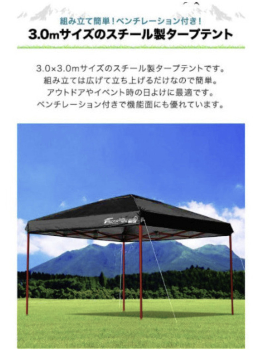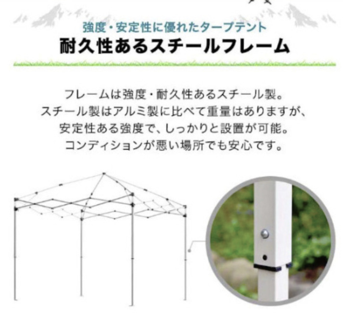 タープテントのフレームには、強度・耐久性あるスチールフレームを採用。