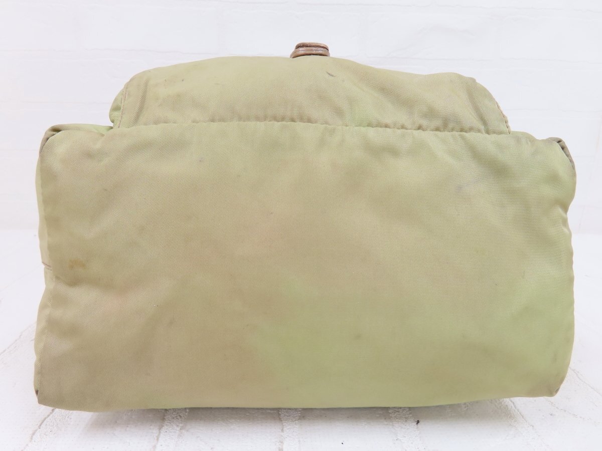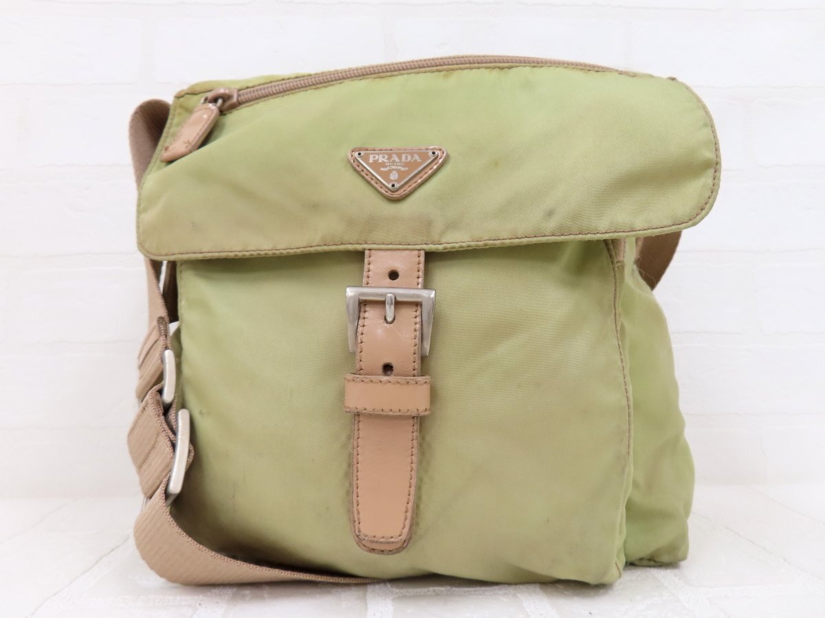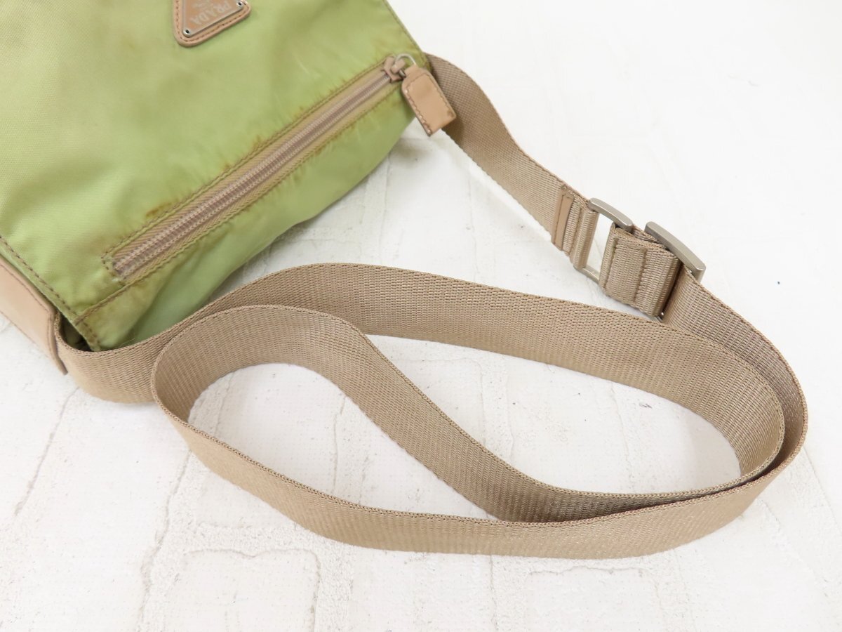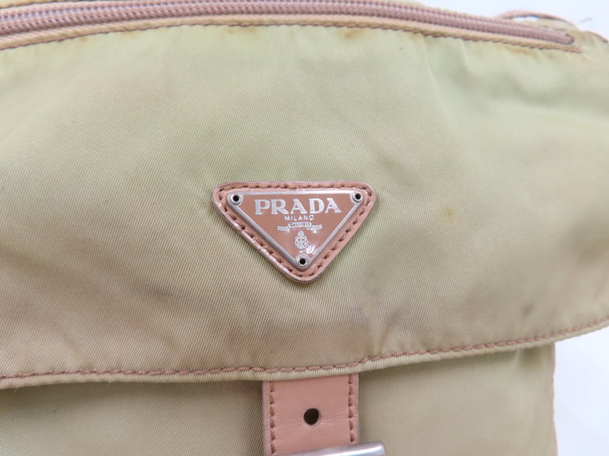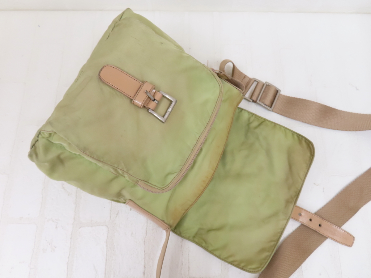◆PRADA プラダ◆ナイロン カーフ レザー 本革◆ショルダー バッグ◆薄カーキ ベージュ シルバー金具◆イタリア製◆フラップ◆A13564