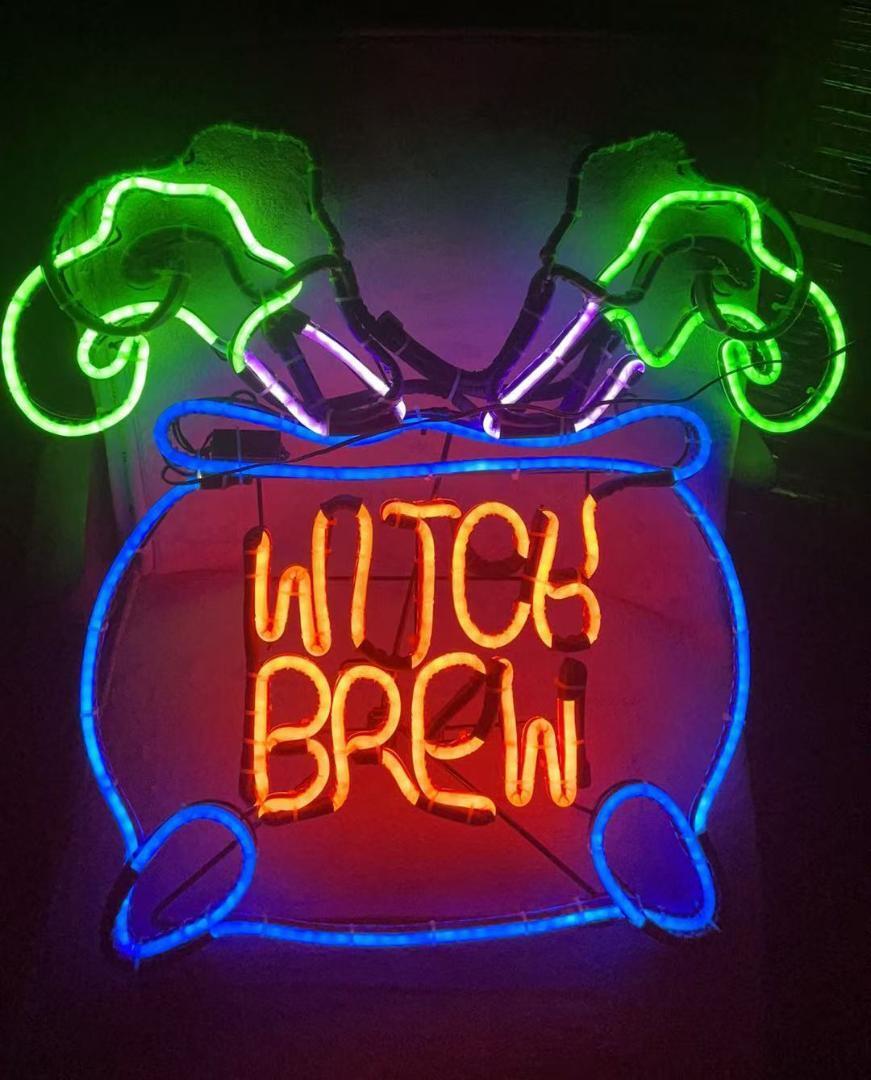 多彩なネオンカラーの「WITCH BREW」看板で、