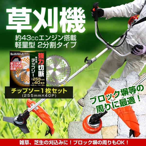 43ccのパワーエンジンは、伸びた草や固くなった枯れ草等をガンガン刈ります。 径の小さい木も刈れるので幅広く使える事も刈払い機の特徴です! 柔らかい草や金属刃では刈る事ができない所(フェンス等)で刈る「ナイロンカッター」が付属しています。 セットがお得な草刈機の替刃も別途販売中。 【商品仕様】 ★草刈り機仕様 ・エンジン:空気冷却/シングルシリンダー/2ストローク ・排気量:43cc ・燃料タンク容量:1.21L ・エンジン出力:1.45KW ・使用燃料:混合ガソリン(25:1) ・点火方式:電子点火 ・始動方式:リコイルスターター ・キャブレター:ダイヤフラム式 ・重量:7.04kg(本体のみ) ★チップソー仕様 ・サイズ 外径255mm ・刃数 40P ・枚数:1枚 【商品内容】 ・本体 ・チップソー1枚 ・カッターブレード ・ナイロンカッター ・飛散防護カバー ・ベルト ・燃料混合タンク ・サービス工具 ・取扱説明書(日本語) 【注意事項】 必ずゴーグル(保護メガネ)を着用の上、使用してください。 お得なセットもございます。 ↓↓↓↓↓↓↓↓↓↓↓ ★36Pチップソーセット 草刈り機 + チップソー(36P)10枚セット ★40Pチップソーセット 草刈り機 + チップソー(40P)10枚セット ※写真と実物は多少異なる場合がございます。あらかじめご了承下さい。 |