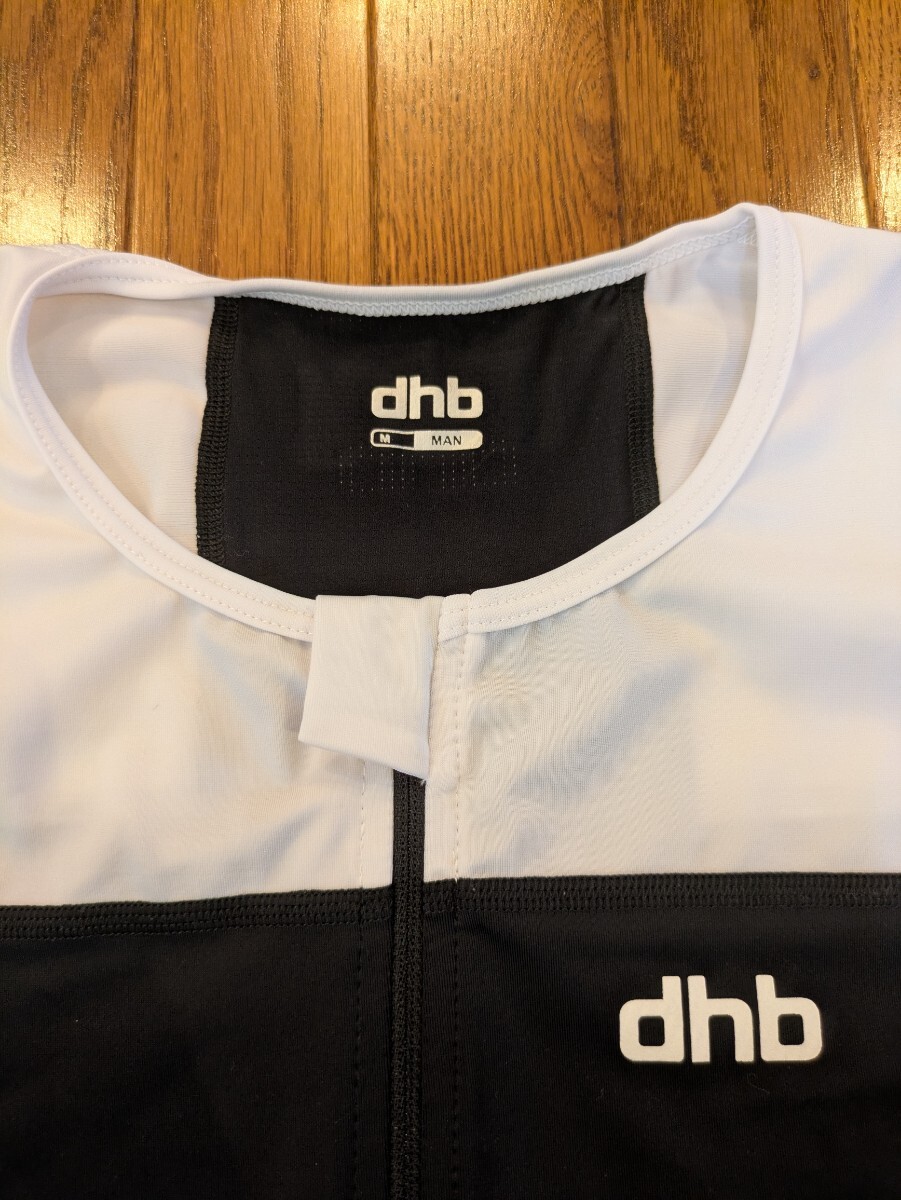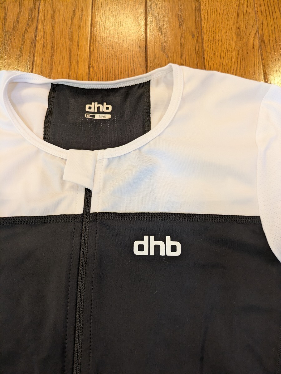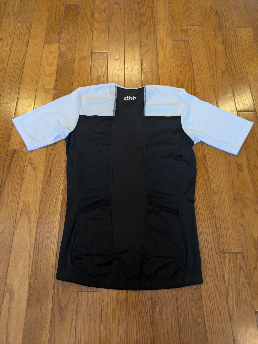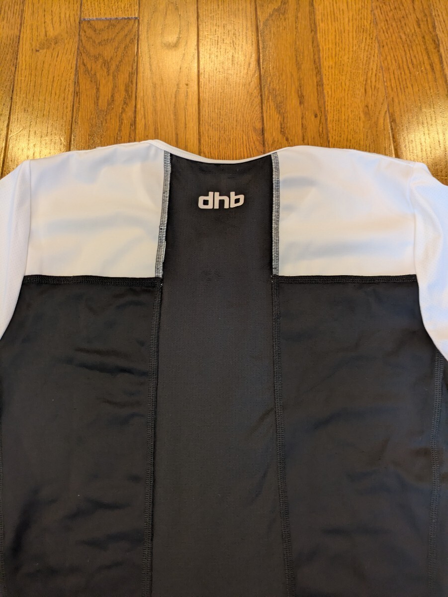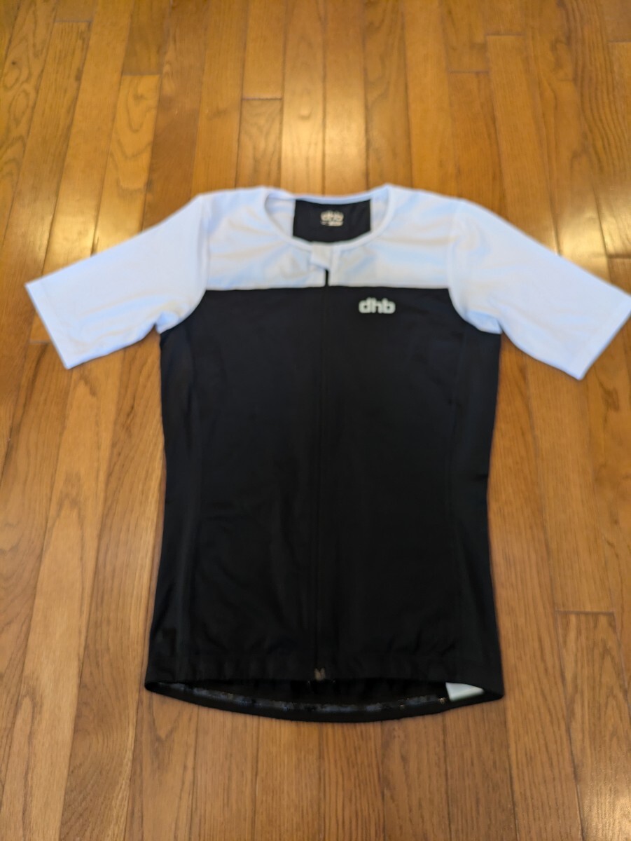 試着のみのサイクリングジャージです。dhbのエアロジャージですのでタイトフィットです。フロントはフルジップで、ロゴが胸元に小さくプリントされています。サイクリング、レース時に快適に着用できる素材感です。