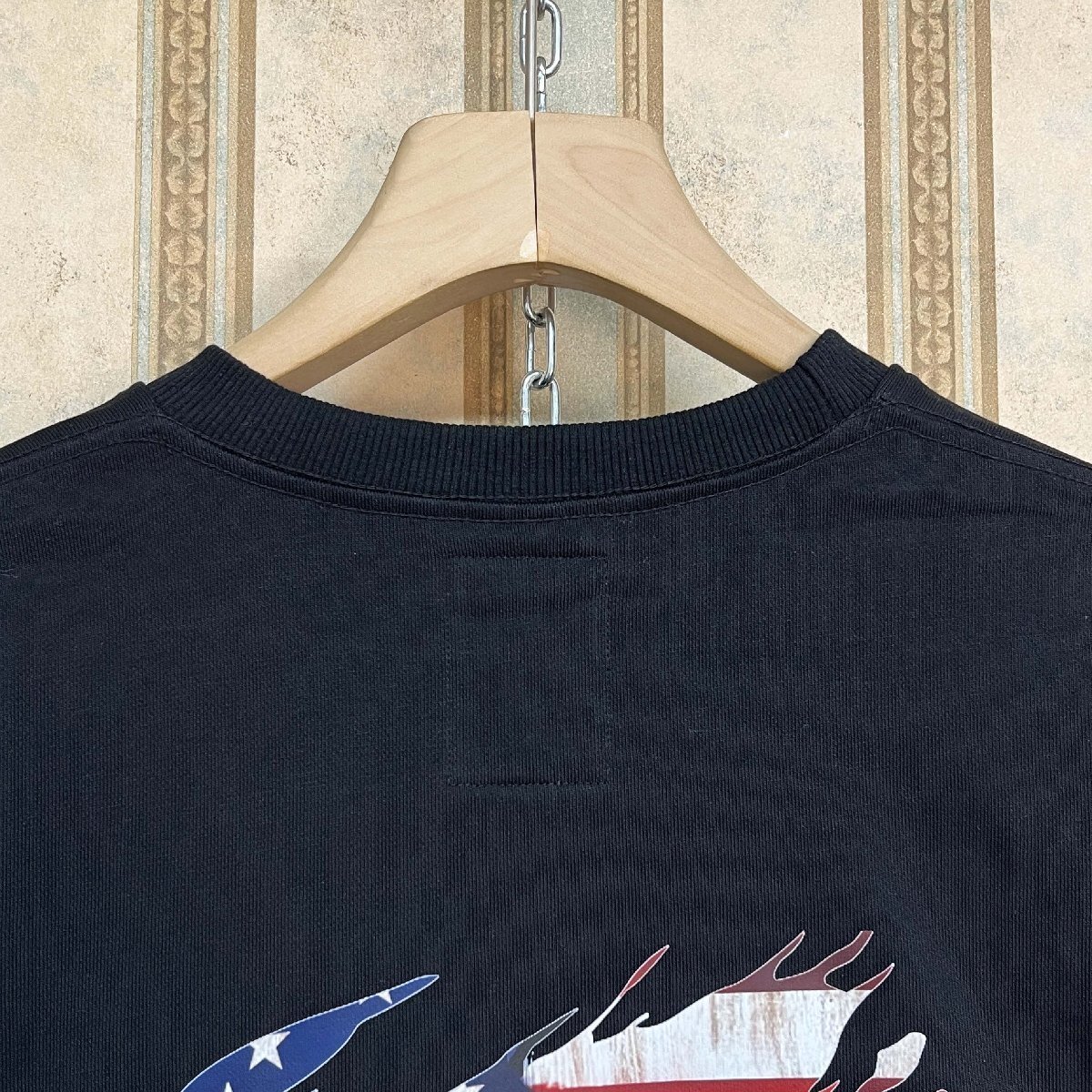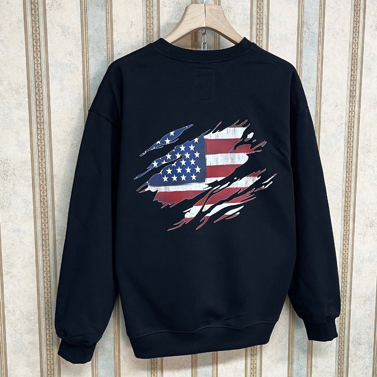 フロントはシンプルで清潔感のある無地デザイン。クラシックなルーズフィットシルエットは体型を選ばず、ゆったりとした着心地で動きやすさも抜群です。背中のユニークなアメリカ国旗プリントが視線を集め、インパクト抜群!