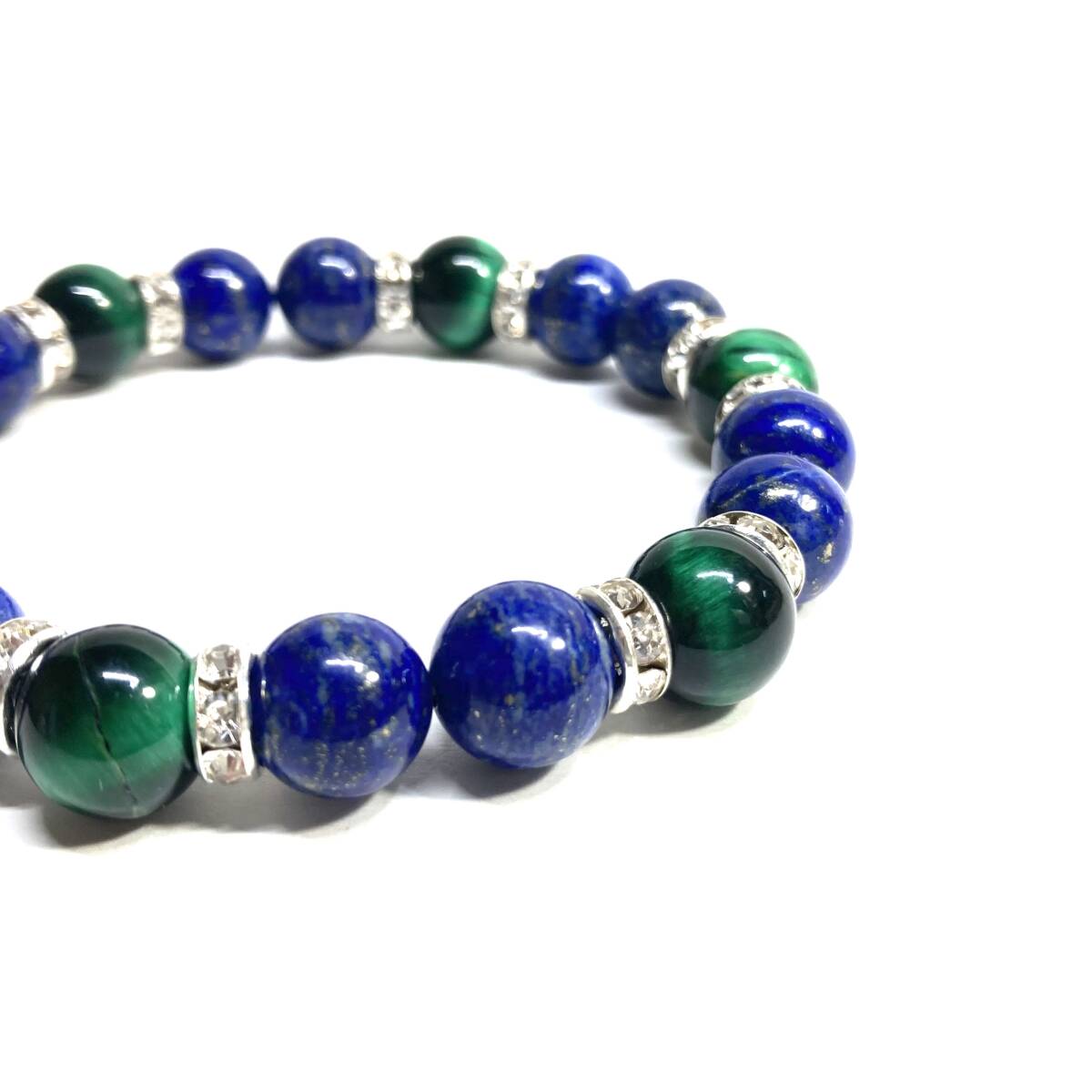 こちらは、ラピスラズリとグリーンタイガーアイを組み合わせたパワーストーンブレスレットです。間にはロンデルを挟み高級感あるデザインに仕上げております。石大きさは腕にも馴染みやすいように10mm玉で内径約18cm(伸可能)です。(サイズ変更の場合は取引ナビにてご連絡をお願いします。) 数に限りがございますので気になる方はお早めにどうぞ。