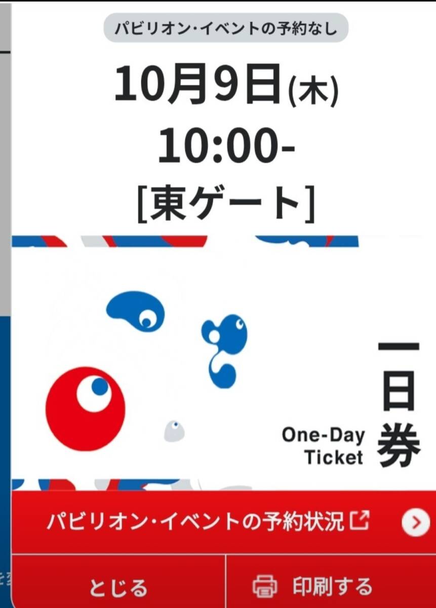 大阪関西万博 EXPO2025 電子チケットID 大人平日券1枚 来場日は10/9 木曜 10:00 東ゲート を予約済です。 日付変更は最大3回まで可能です。 都合がつかなくなり、 既に空きがなく予約や予約変更ができなくなってきていますので、もし、よろしければ、いかがでしょうか?■入場日の縛りがない券種です。平日のみならず土日祝日にも入場可能。 ■スムーズな取引完了のため、万博ID作成後にご入札をお願いします。 ■電子チケットの利用方法をご理解されている方のみご入札下さい。 ■お支払い確認後、チケット受け取り用URLを取引ナビからお知らせします。匿名取引のために発送方法を設定していますが、実物の発送はありません。 ■受け取り用URLの有効期限24時間以内に必ず受け取りできる方のみご入札下さい。 ■電子チケットの商品性質上、受け取り用URL連絡後のキャンセルは出来かねます。ノークレームノーリターン。予定が無くなったので譲ることになります。