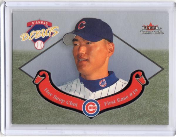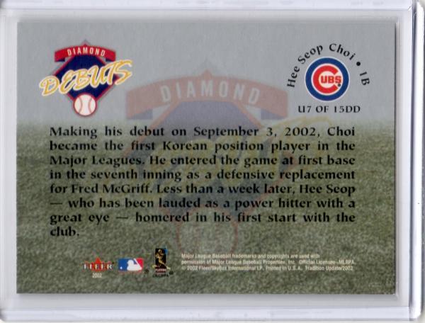 DIAMOND DEBUTS #U7 OF 15DD チェ・ヒソプ MLBルーキー・カード ------------------------------------------------------------- ■チェ・ヒソプ MLB成績 1999年カブス入団 2002年MLBメジャー・デビュー 2004・05年 15本塁打 2006年WBC韓国代表「4番」 2009年韓国プロ野球起亜で、33本塁打 100打点 打率.308 チェ・ヒソプ・ファンの方、是非どうぞ! |