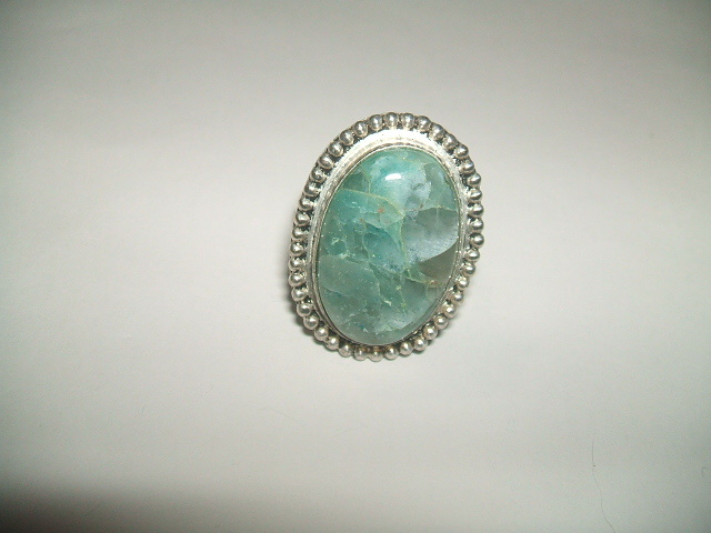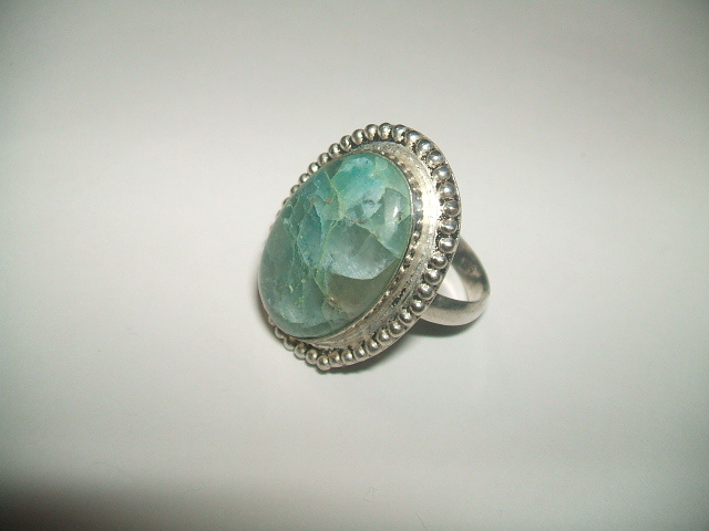 グリーンの濃淡の模様が神秘的なクォンタムクワトロシリカリングです。石の大きさは2.4x1.6センチ。金属はシルバーで925の刻印があります。