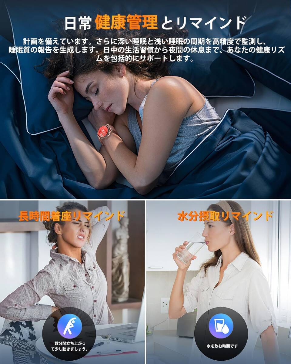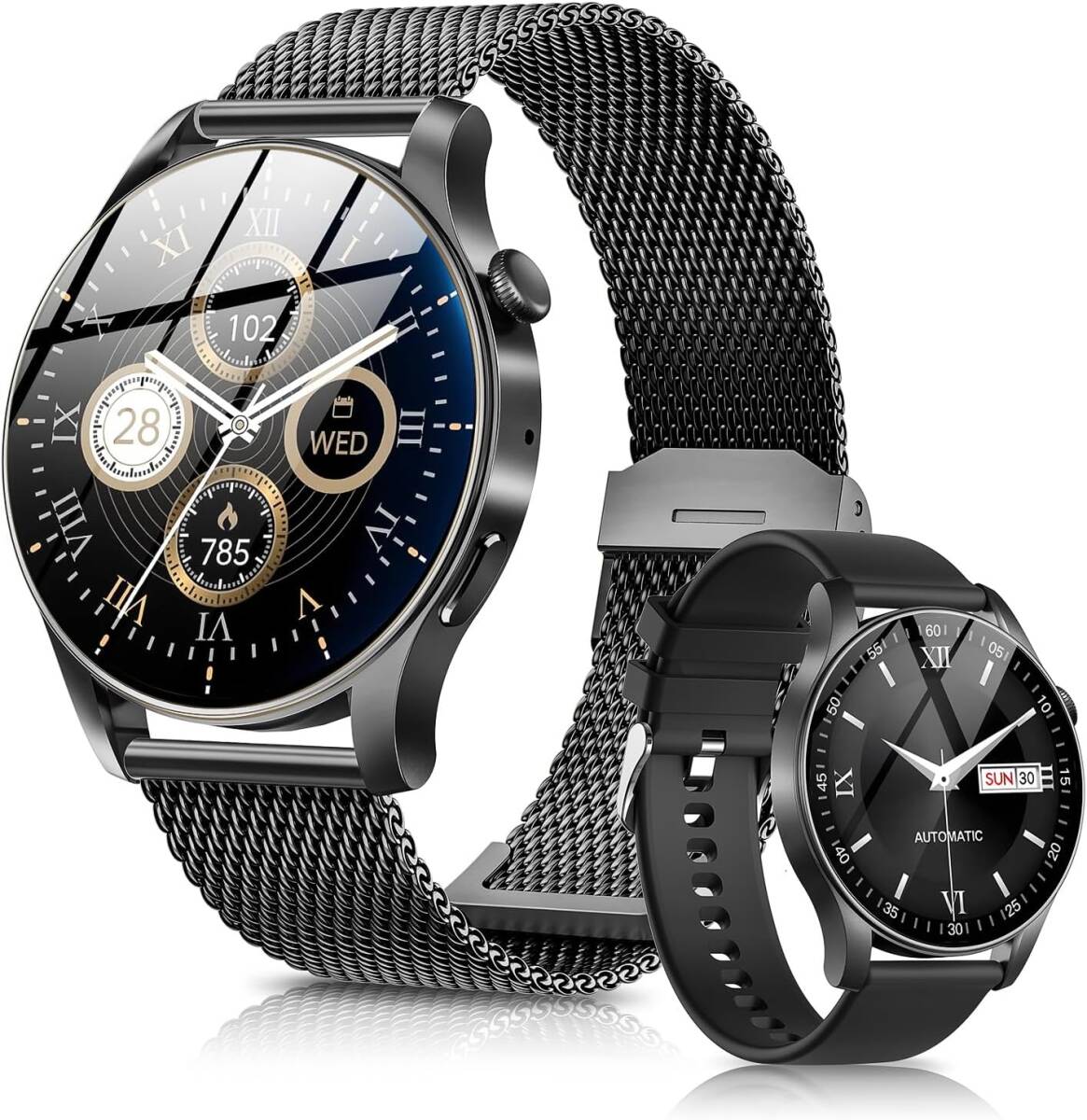 ブラック色 スマートウォッチ 2025新登場 丸型 1.43インチ AMOLED 高精細画面 2種バンド付き 通話機能付き LINE メッセージ通知