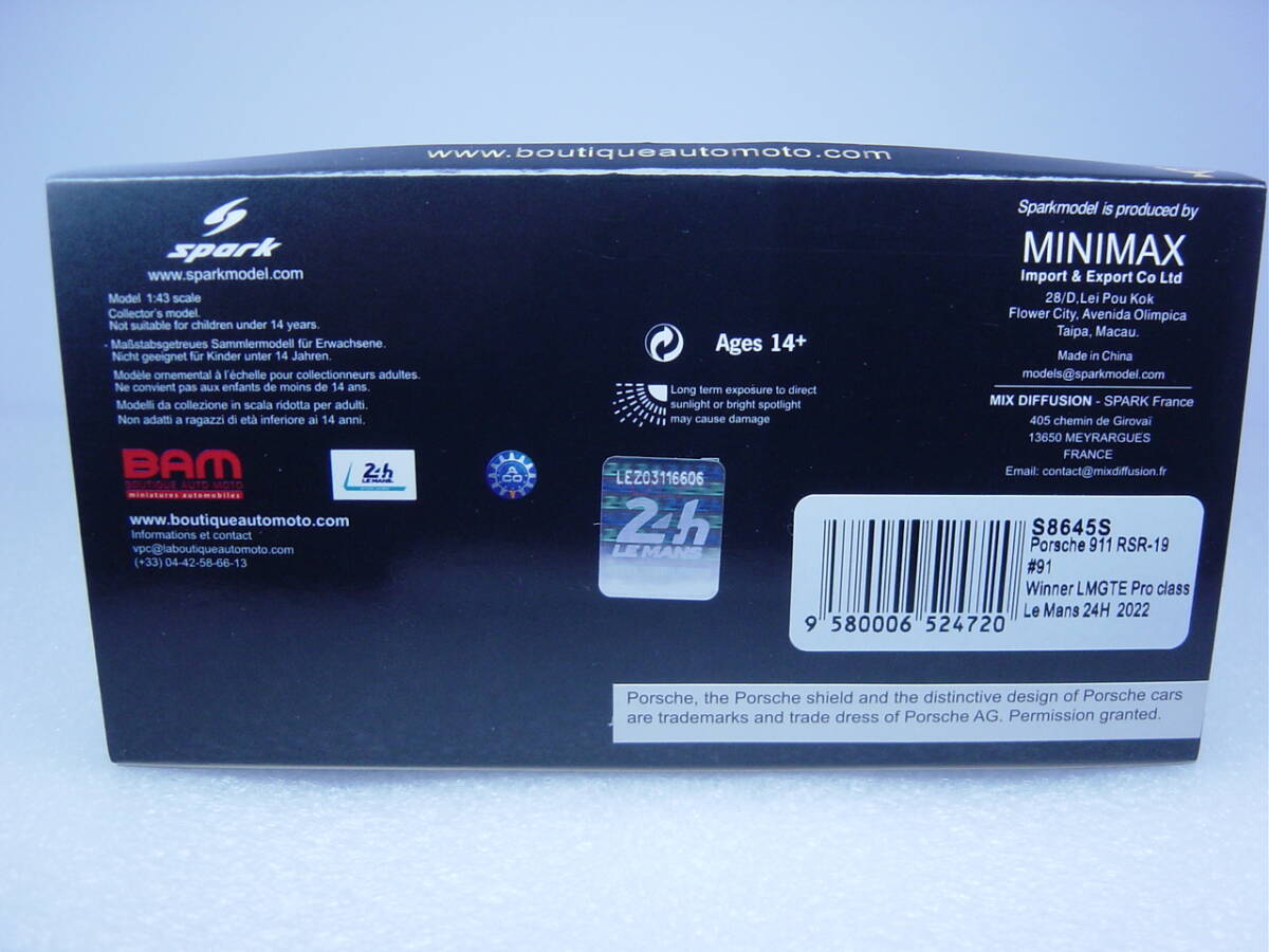 spark BAM別注 1/43 Porsche 911 RSR-19 Porsche GT Team Winner LMGTE Pro Class Le Mans 24H 2022 ポルシェ ル・マン トロフィー付き