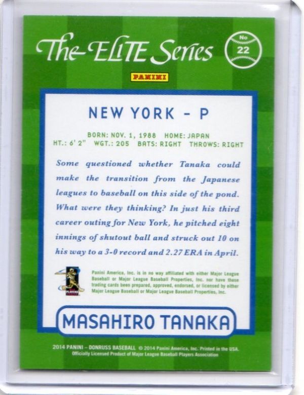 2014PANINI-DONRUSS BASEBALL THE ELITE SERIES RC ROOKIE CARD #22 シリアルNo.819/999枚限定 田中将大 MLBルーキー・カード 田中将大ファンの方、是非どうぞ! |