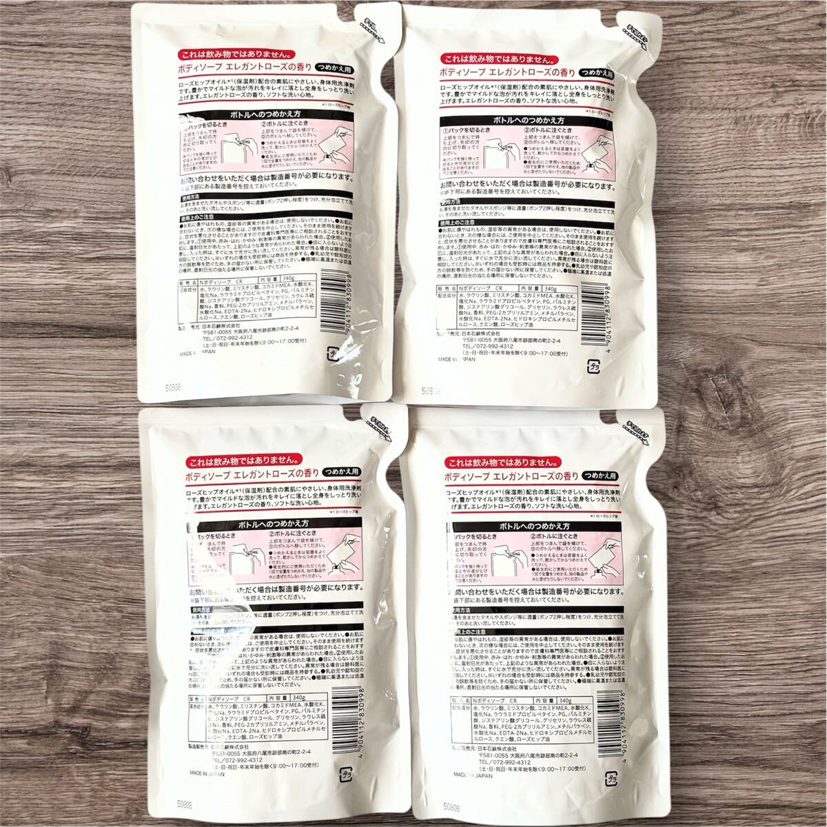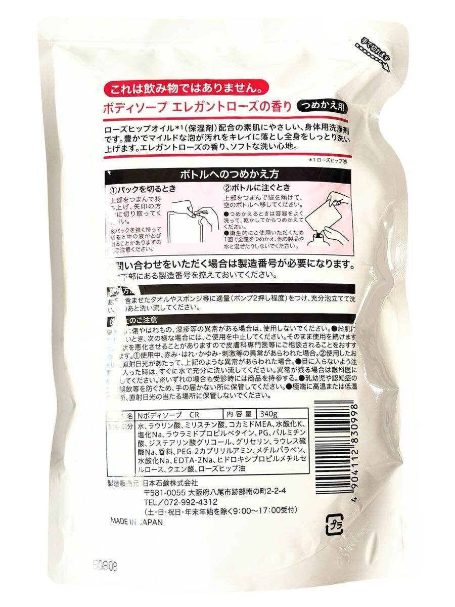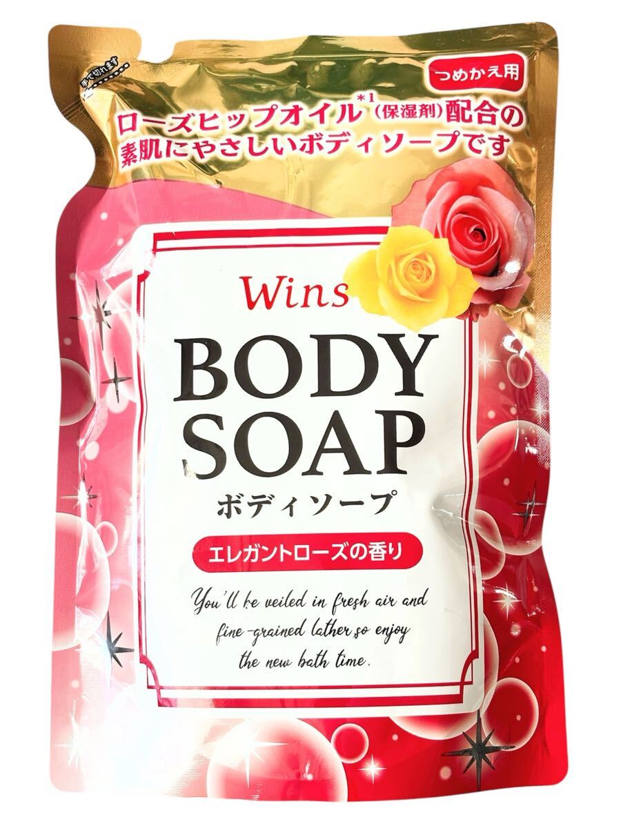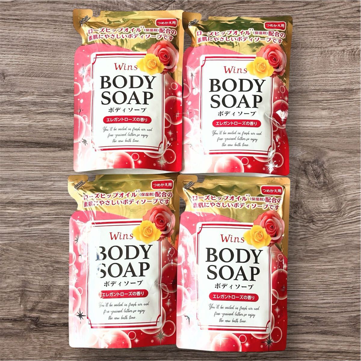 ローズヒップオイル(保湿成分)配合の「Wins ボディソープ エレガントローズの香り」詰め替え用4袋セットです。