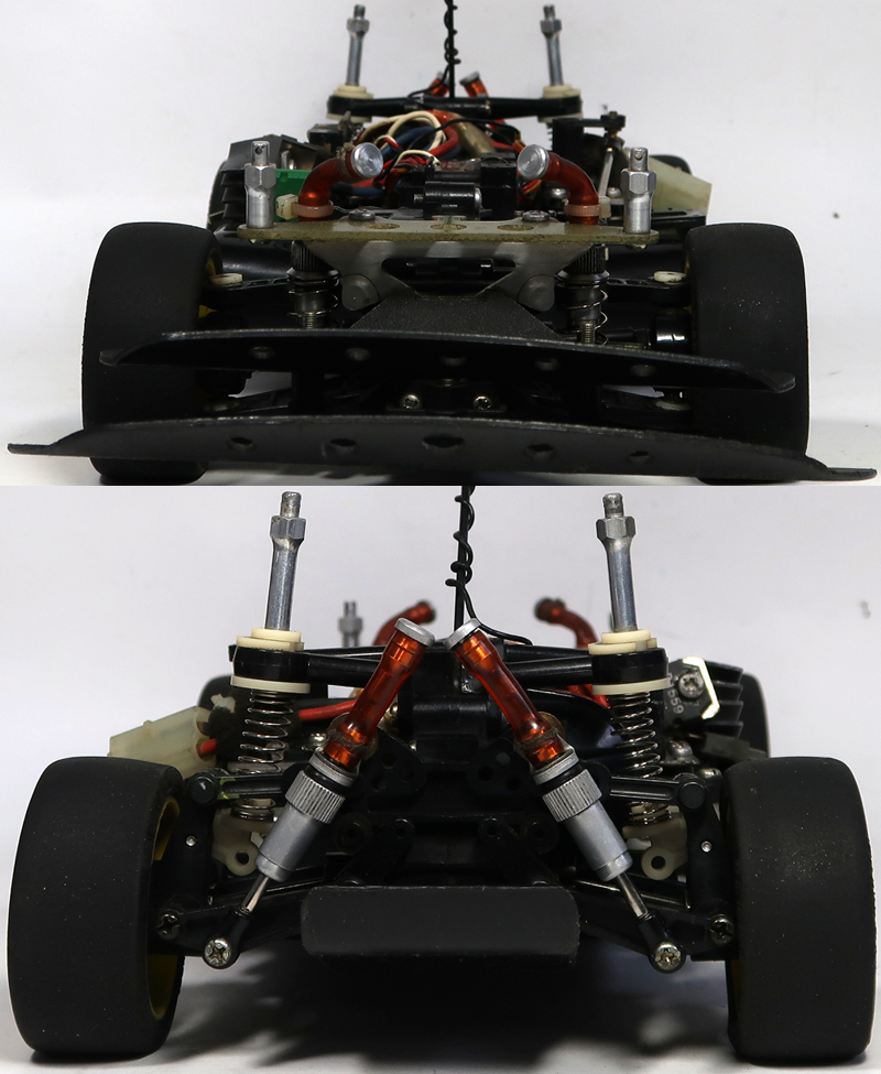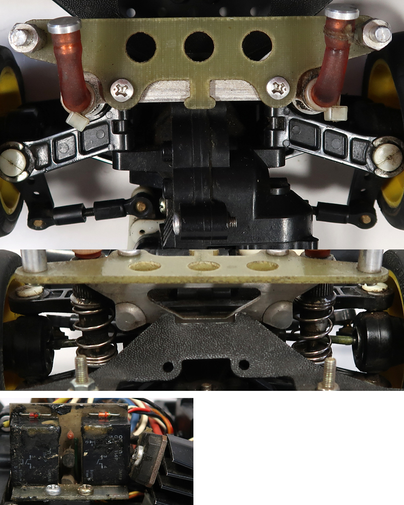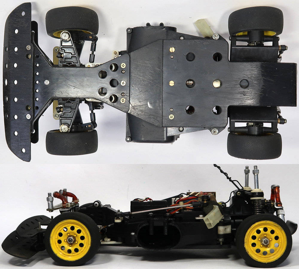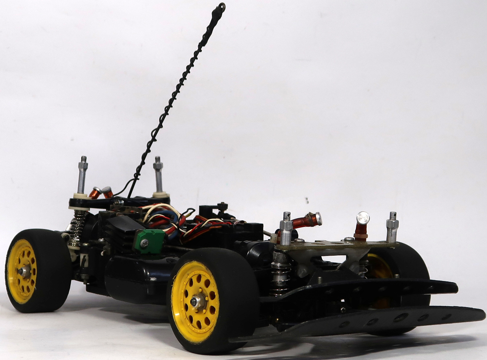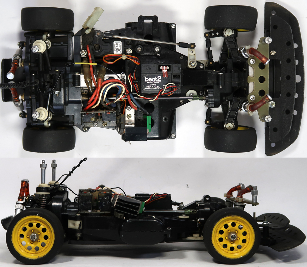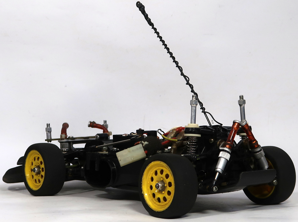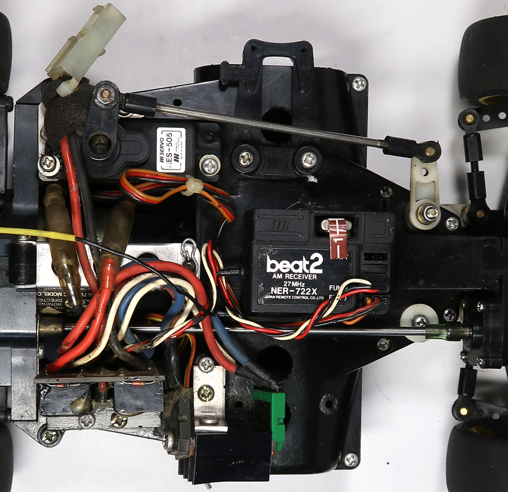 出品は画像の物のみです。他に必要なものはご自分でご用意ください。ボディはありません。付属のバッテリーは消耗品ですのでいかなる状態であったとしてもノークレームです。バッテリーが不要な方がいましたら落札後にお伝え下さい。出品前にある程度のクリーニングはしております。使用品ですので所々に擦り傷や汚れが有ります。フロントのダンパーオイルケースが曲がっています。タイヤは劣化しております。右リアサスペンションアームが折れていたのを修復しております。アクリルサンデーで溶かしてくっつけています。画像をご覧ください。スピードコントローラーはアンプに換えられています。アンプのメーカーはわかりません。私が確認する限りはその他にひどい破損は確認出来ませんでした。JRプロポの送信機、サーボ、受信機とアンプが付属します。バッテリーを充電してテストしましたが、動作はしました。このままでもすぐに走らせる事は可能ですが、完璧に動作させるためにはさらなるメンテナンスは必要かと思います。分かる事は以上です。お取引後は一切のサポートはしておりません。また必要なパーツはお取り引き後にご自分でお調べください。お取り引き後に説明以外の不足品や説明以外の破損や故障が有ったとしても返品は出来ませんしクレームもお受けできません。