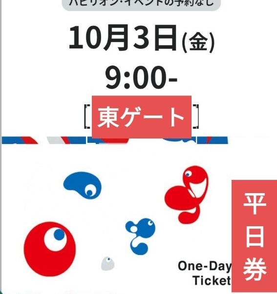 10月3日(金)9時入場 東ゲート 入場予約済 大人小人1枚づつ、合計2枚です。