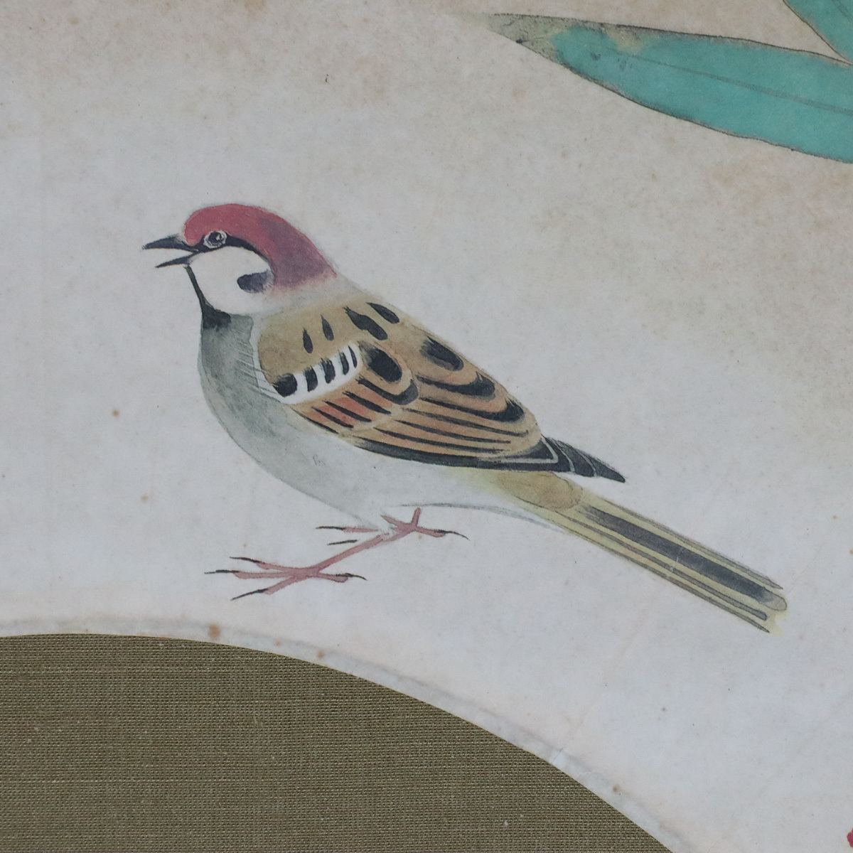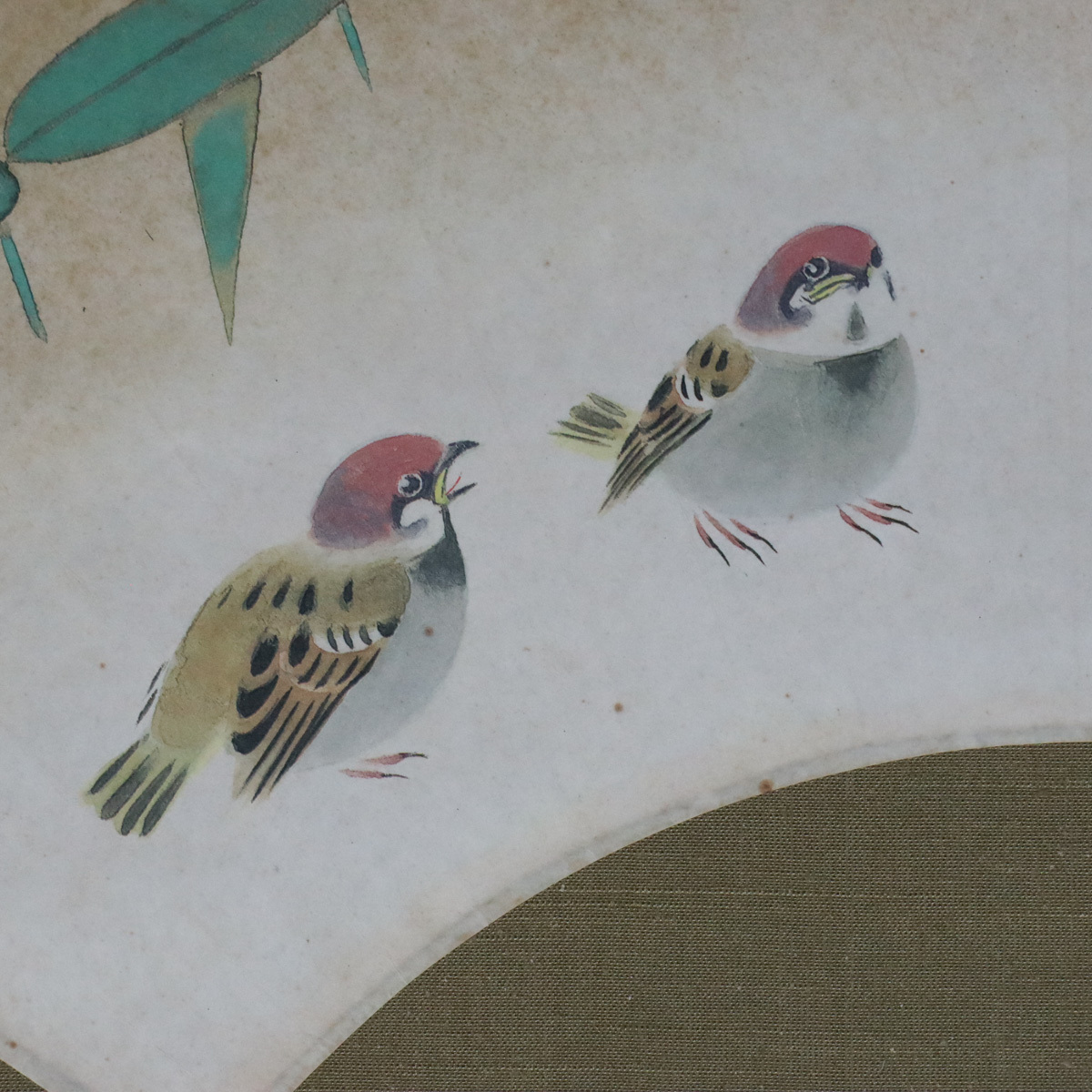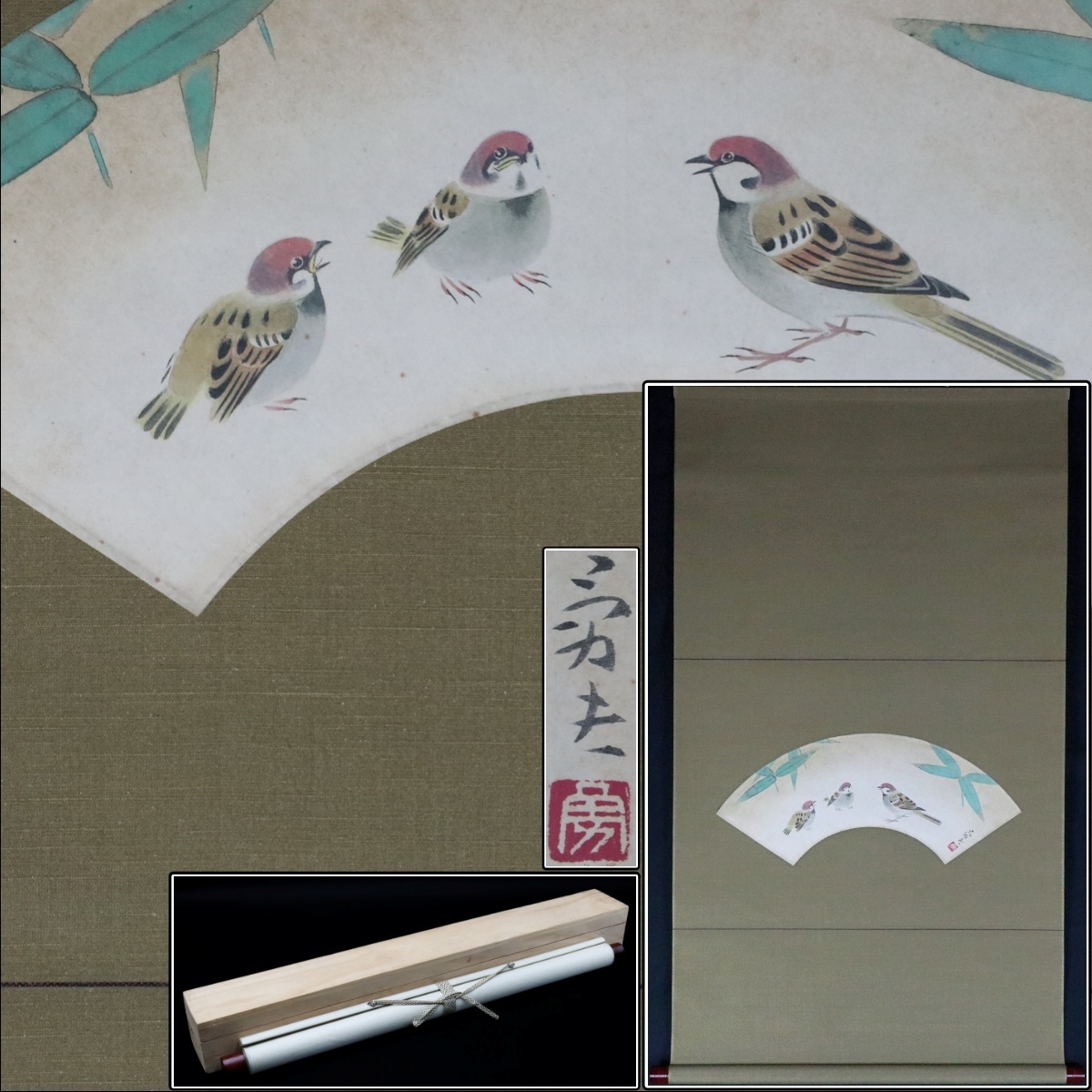 【宙】真作保証 河原勇夫 雀に竹図 扇面 紙本 日本画 掛軸 落款有 合箱 三羽雀と竹葉を描いた優美な構図 日展会友 [D]9G28.i.3.3.D