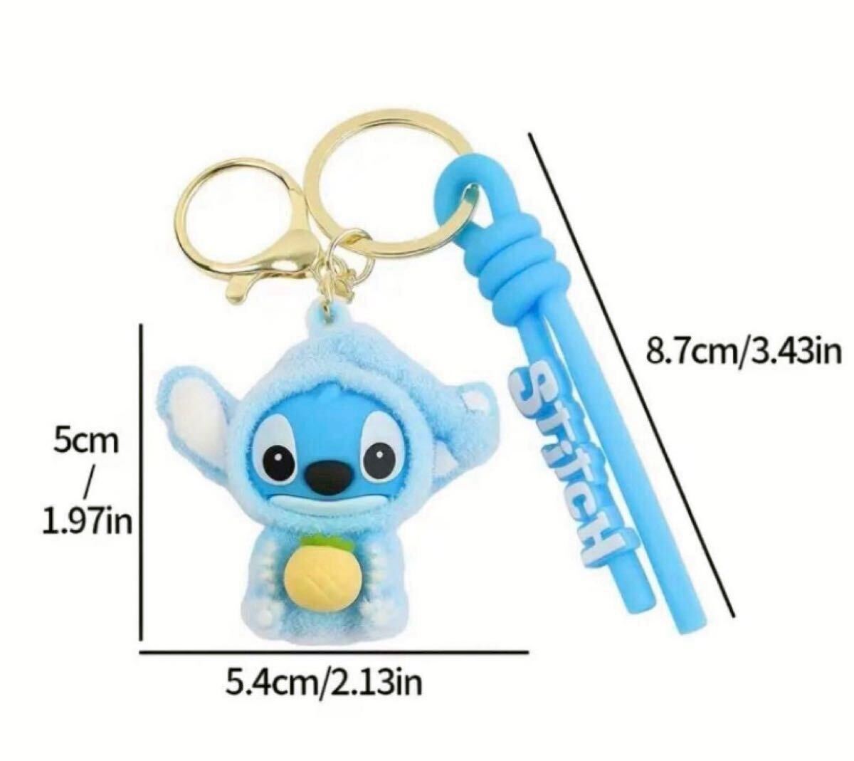 ふわふわのスティッチキーホルダー、グリーンのキャラクター付き。
