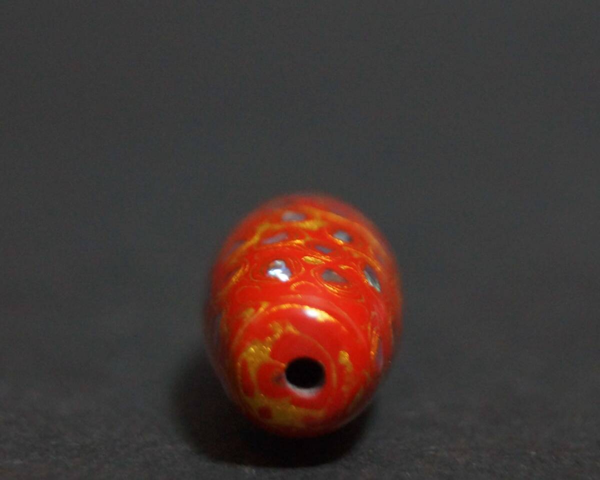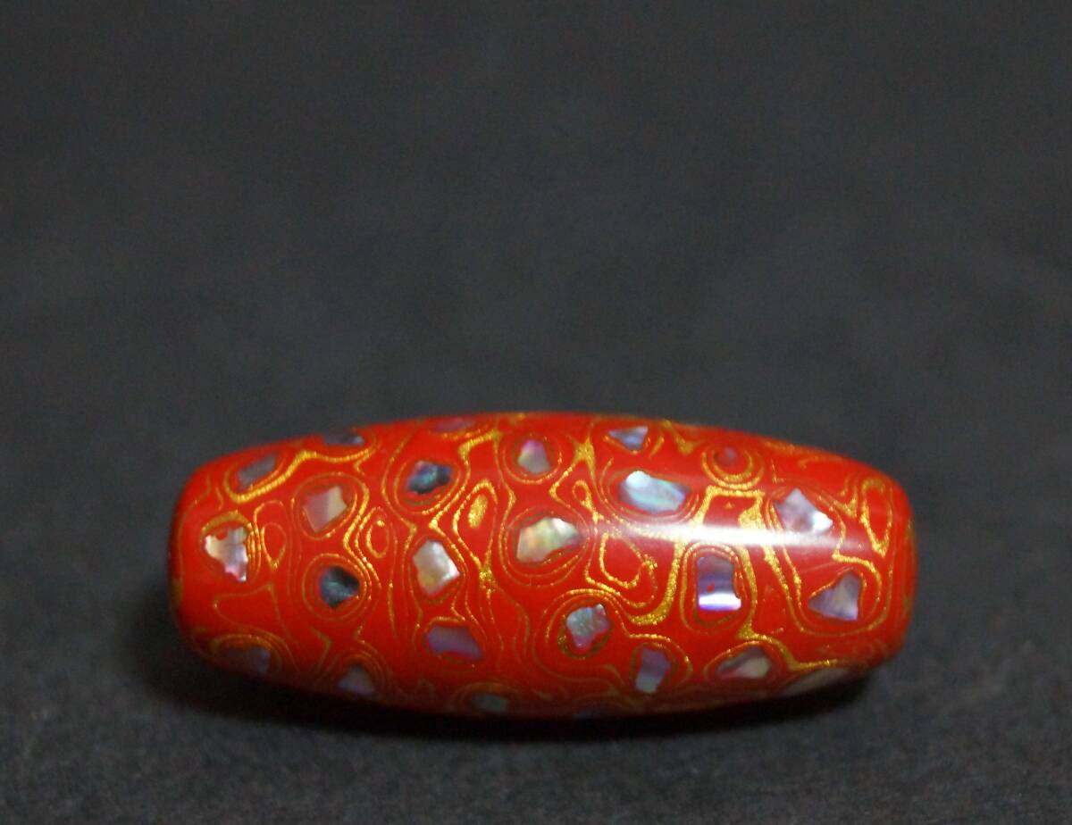 【寂】木製漆塗り 赤地螺鈿象嵌 棗形根付 緒締玉 提げ物 ビーズ 装飾品 長さ2.8cm☆美しい木目☆s71002