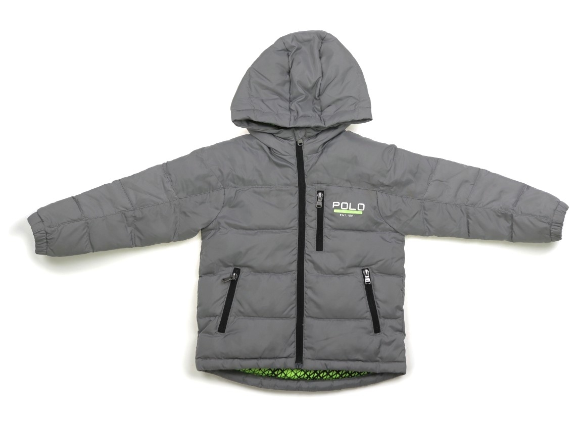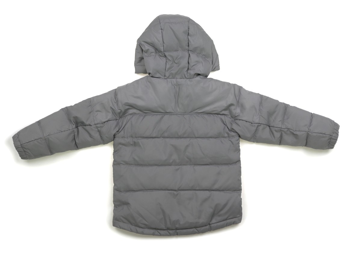 ポリエステル素材。中綿はダウンフェザーです。左肩に黄色っぽい汚れ、表地や後ろに油じみが複数あります。左胸のプリントに剥げ、前ファスナーの上げ下げが固いです。外遊び用にいかがでしょうか。フードは縫い付けです。