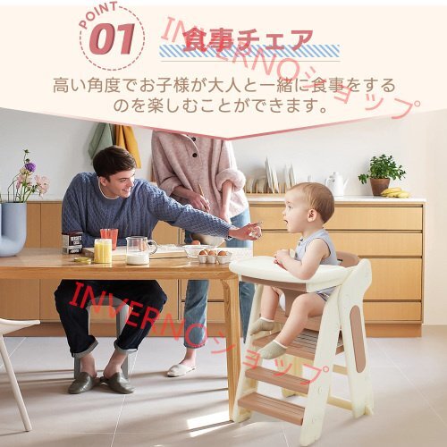 • 【他のモードに変身でき】A食事チェアからガードレール付き踏み台へ変身 トレーを外してからガードレール付き踏み台になります。洗面所やキッチンで自立練習に役たつ。B 3段階式 ネジを外す必要はありません!ガードレールを後ろに回すだけで、3段階モードに変身できます。ハイチェアor踏み台として使用可能。C 2段階式 上の板を下に下げると、2段階モードに変更可能。子どもの成長に合わせて板の高さを調節でき、様々な用途で自由に使えます。座っても立っても使えます。D ローチェア 背もたれを取り付ければ、お絵描きや読書用の子供用椅子としても使えます。